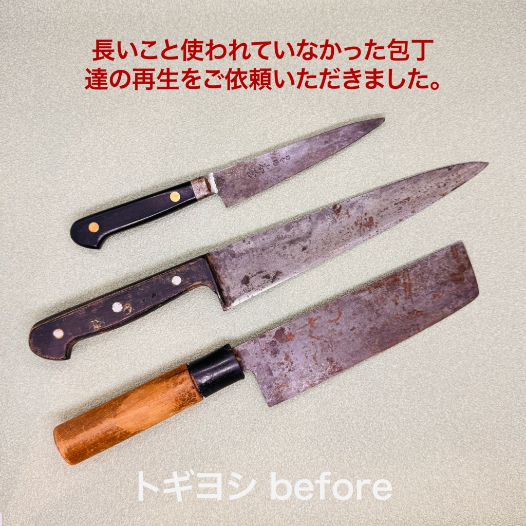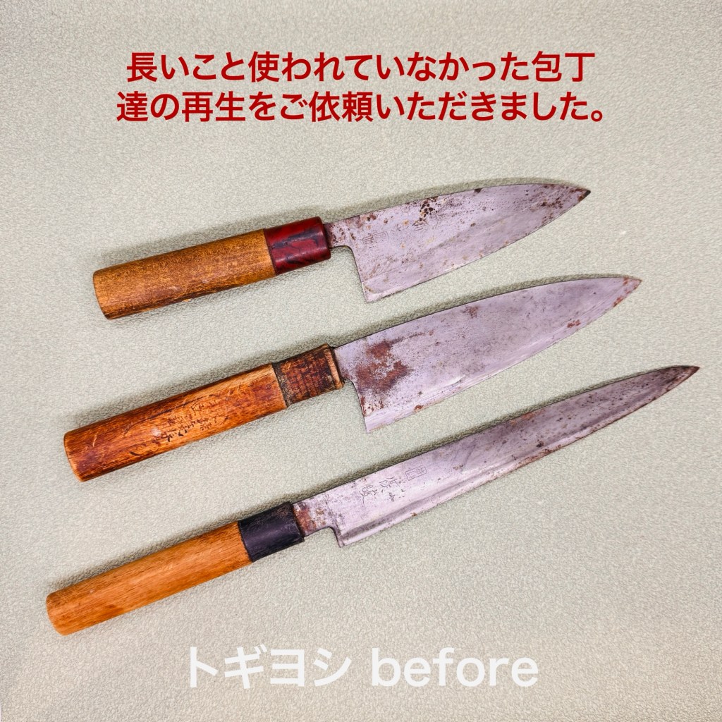 義勝の薄い出刃は錆が深かったのでサンダで削り見栄えが良くし、こちも羽先には影響無かったので綺麗に仕上がりました。