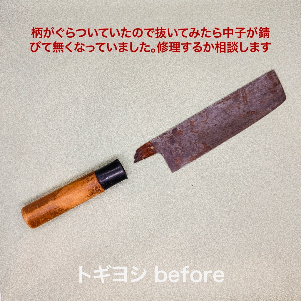 優駿の菜切りは柄ぐらついている事に気づいて柄を抜いたらご覧の通り中子が錆びて無くなっていました。中子の修理は研ぎ代より高価なのでお客様に相談します
