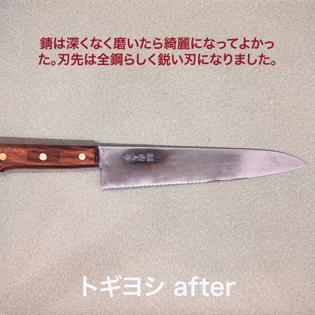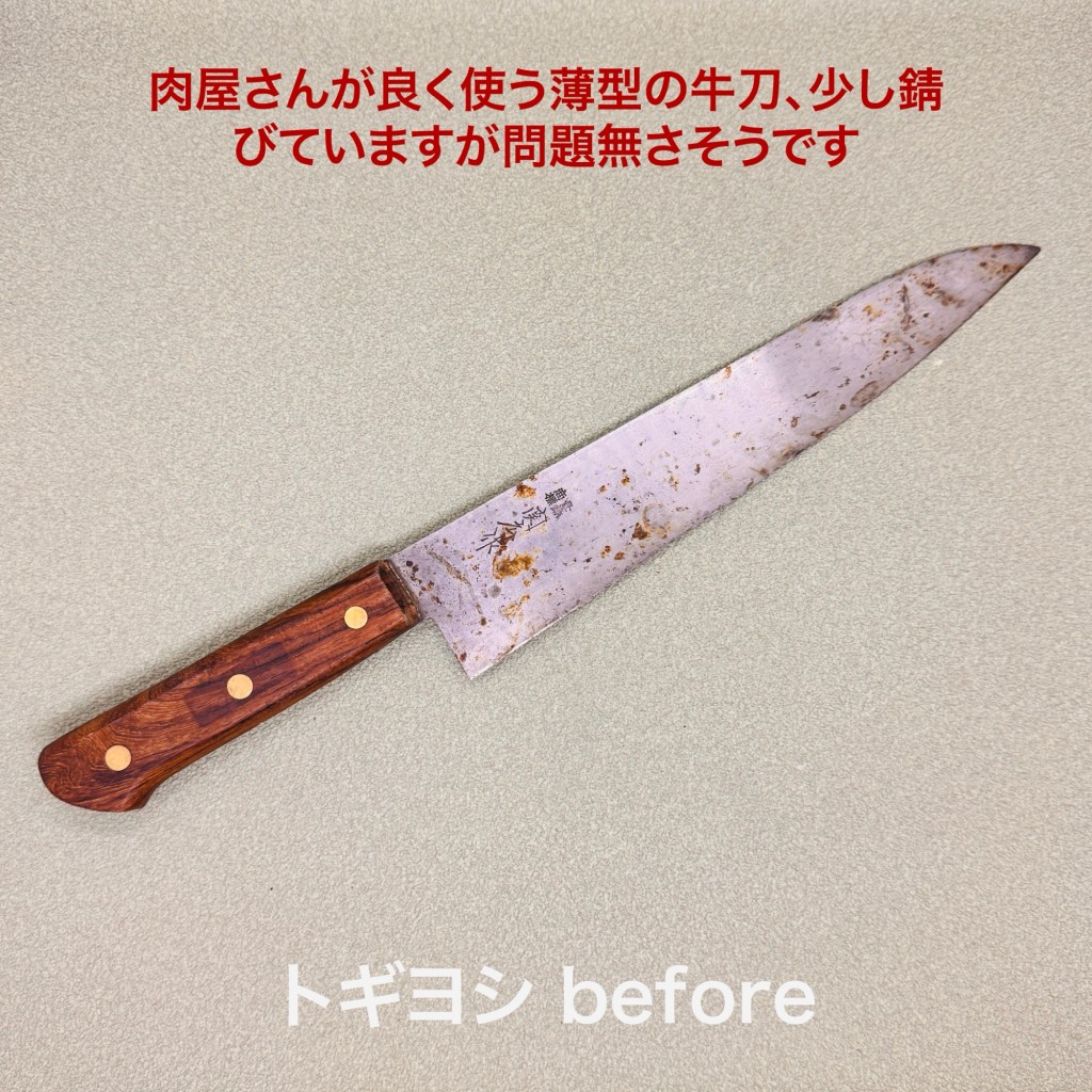 関広の牛刀は薄い作りで肉屋さんが使うことが多いタイプ。かなり軽い作り。錆も少なく磨いたらピカピカに!刃先も特に傷んでおらずスムーズに仕上がりました。