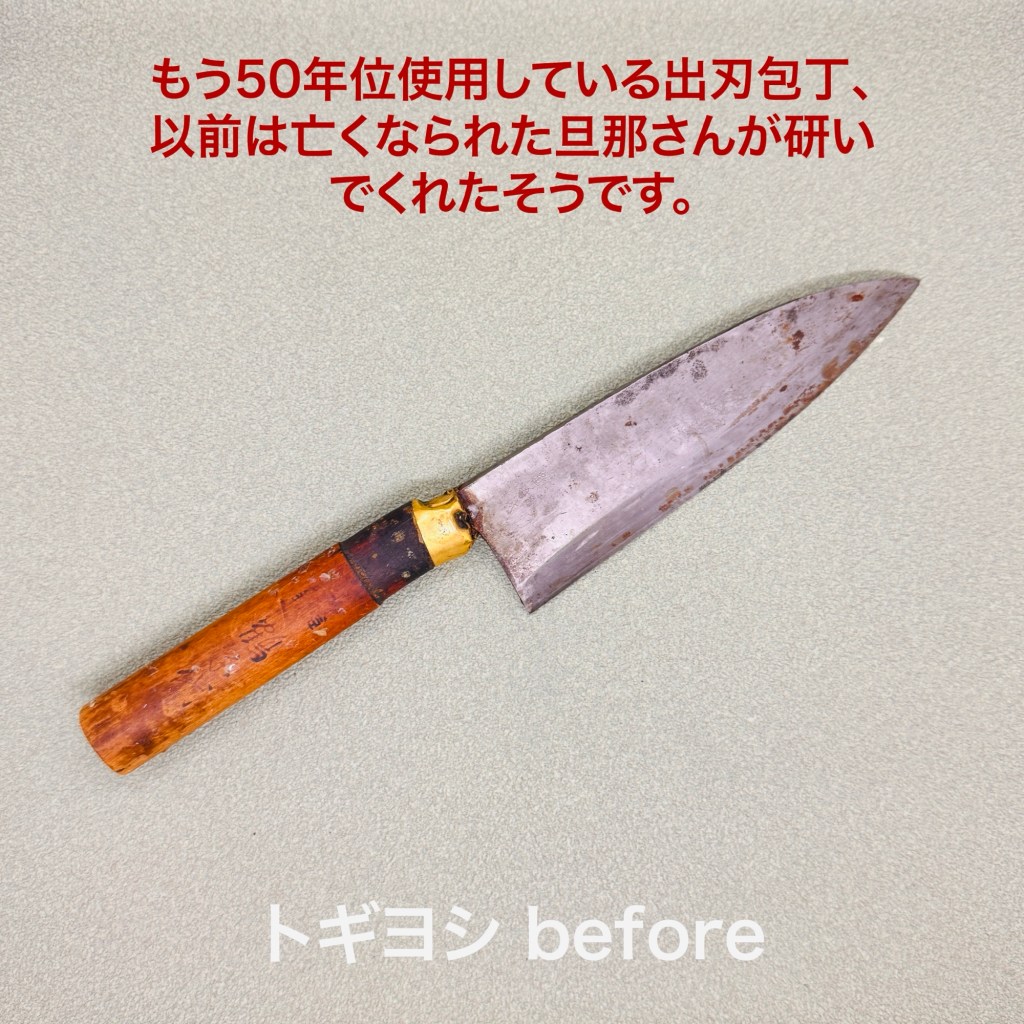鶴千代の出刃包丁は50年以上使われている包丁。ご近所さんで向かいのコープから包丁研ぎの幟を見てご依頼いただきました。これまではご主人が研いでくれていたそうで亡くなられてからは研いでおらず魚を捌いたら切れなくてとここと。柄の桂が真鍮製で歪んでいたので柄を交換。中子もすっかり錆びていたのでディスクグラインダで削ってから柄を交換。切刃は緩く盛り上がっていたので20度で研ぎ直しました。