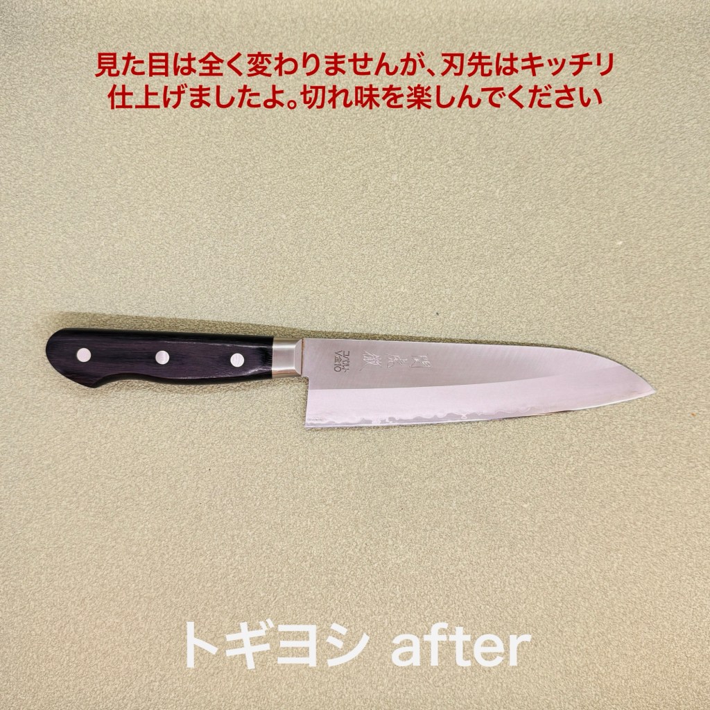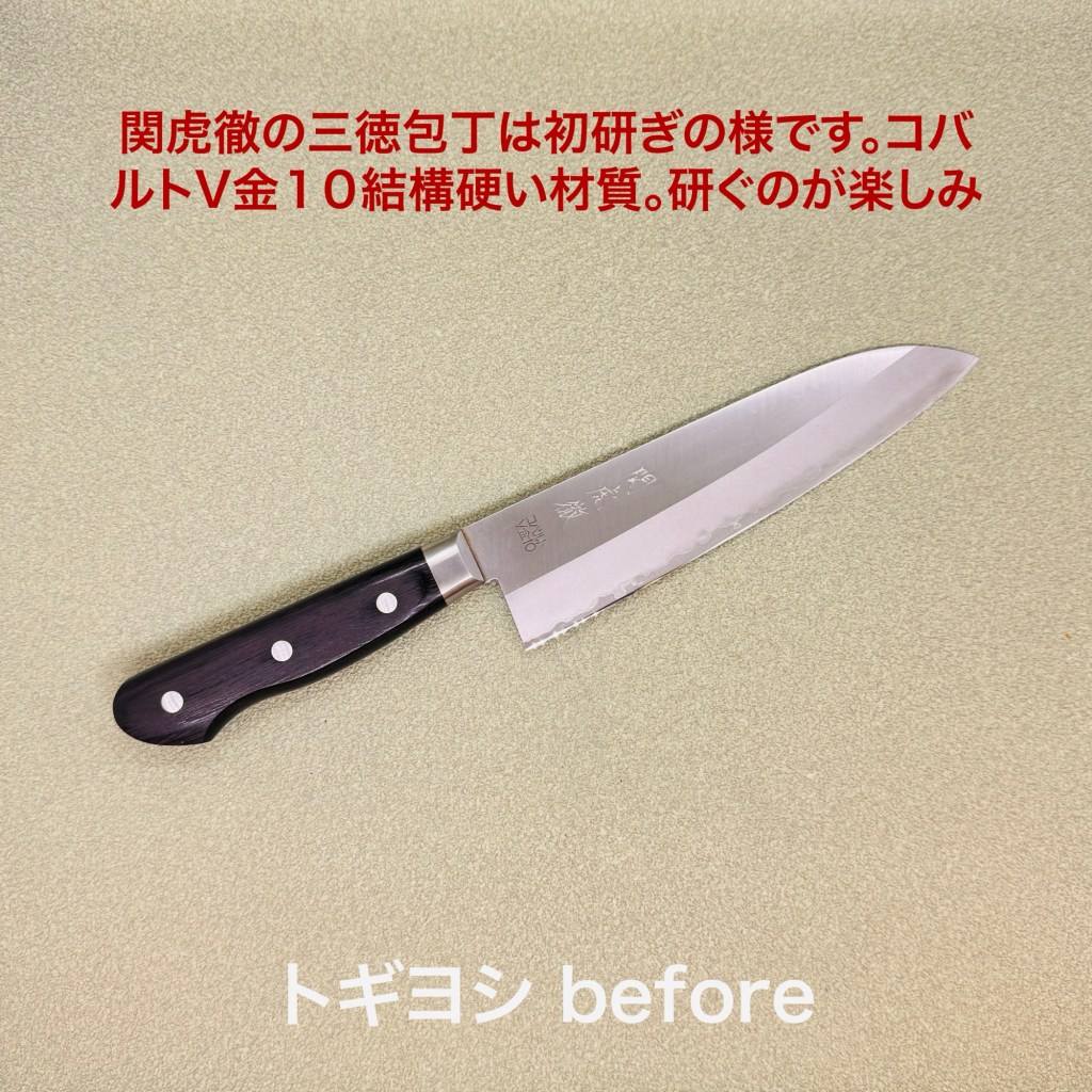 関虎徹の三徳包丁は初めての研ぎの様ですね。コバルトV金10という硬い材質。高い包丁に使われます。研いだ感じは普通より硬いかなという感じで研ぎやすい材質でした。もちろん仕上がりもバッチリ!