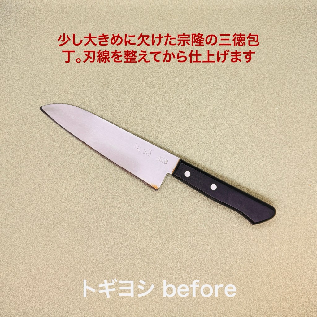 宗隆の三徳包丁は修学旅行土産の定番。ちょっと大きめに欠けていました。鋼の露出が多いので欠けやすくなっています。刃線を整えながら欠けが消えるまで削り続けて刃身を薄めてから切り刃を研ぎ出しました。