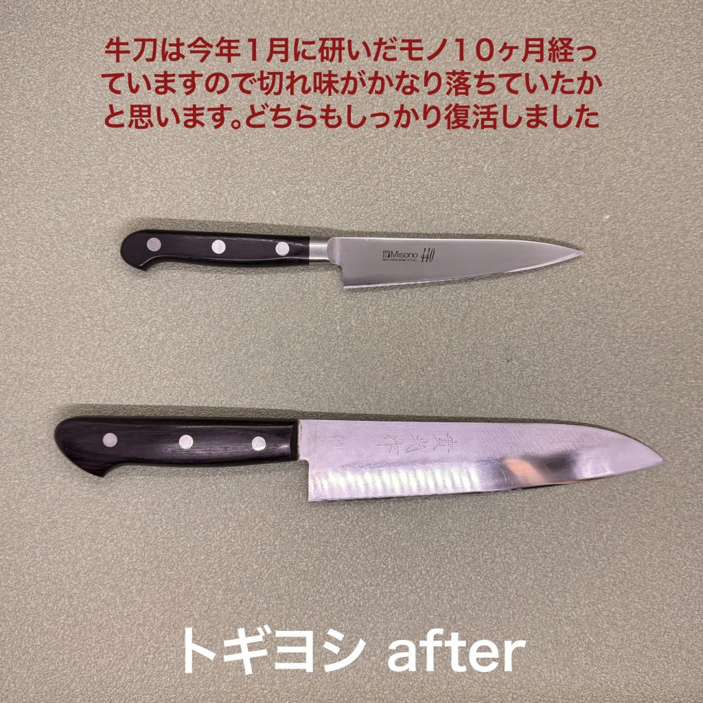 實光牛刀は今年1月に研いだモノ。だいぶ切れ味が落ちていたかと思います。前回刃身を整えていたので刃先に集中して研ぎ上げました。