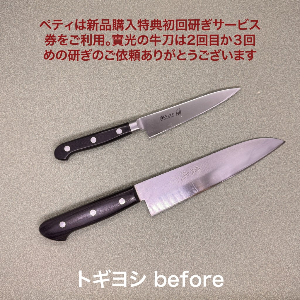ペティは新品を購入いただいたモノ。トギヨシでは新品を購入いただくと初回の研ぎサービス券が付いていますのでお買い得ですよ。刃先を見るとキラキラする凹んだ部分が多数あり、切れ味が落ちていましたのでカッチリ研ぎ上げました。