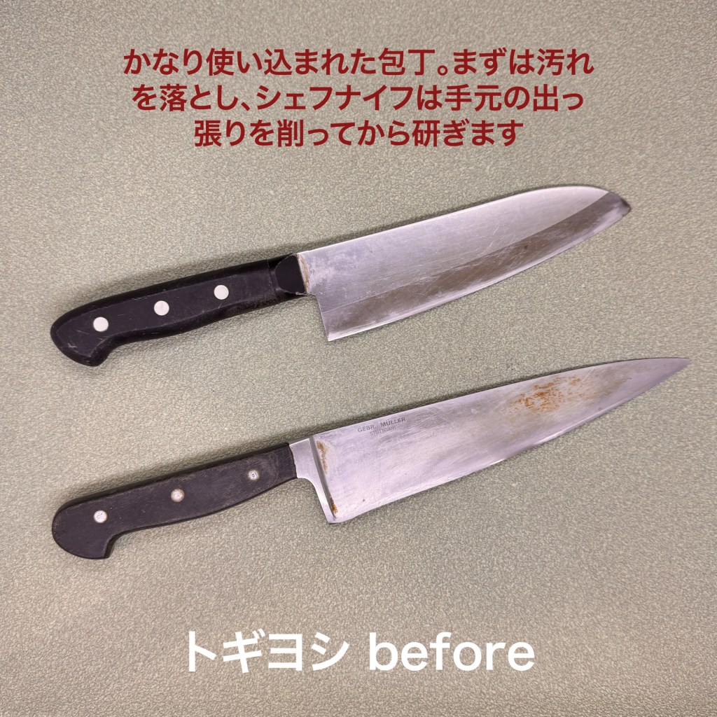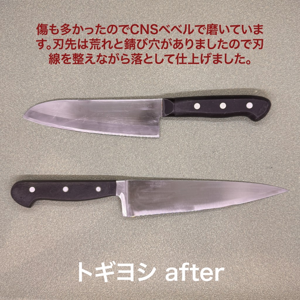 かなり使い込まれた包丁達。まず油汚れを落とします。刃も柄も油が残っていましたのでアルスの刃物クリーナーとゴム砥石#500であまり傷が入らないように洗浄しました。三徳包丁は刃先の先端の方に錆穴が見えますのでそこが無くなるように刃線全体を削ります。シェフナイフは手元にある出っ張りが残ったままで刃線が下がっているので出っ張りを刃線より低くなるように削りました。三徳包丁はスムーズに研ぎ上がりましたがシェフナイフの方は手元で出っ張りがあるためなかなか思ったように研げなくて苦労しました。