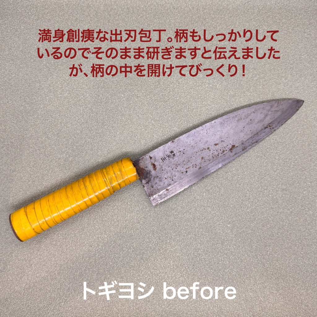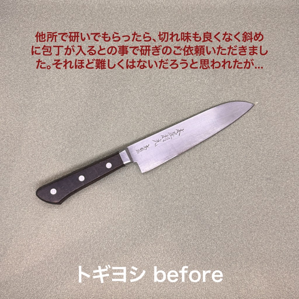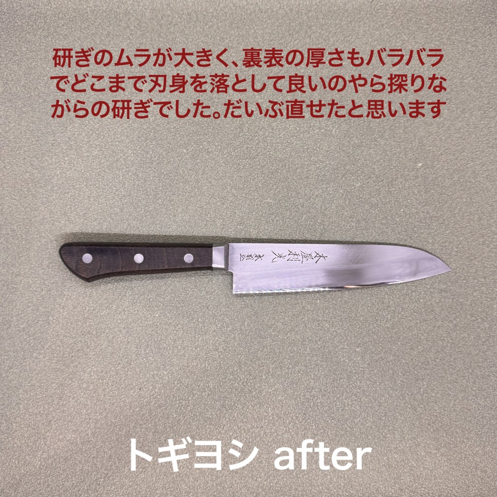 木屋利光の三徳包丁は他所で研がれたモノで切れ味が良くなく、斜めに入ってしまうという事で研ぎの依頼されました。後ろから見ると芯金の位置が著しくズレていて台金が殆どない状態、でもこれは刃身を薄めるのに削ったら後ろに向けて斜めに削れていることが判明。いやー余りにもめちゃくちゃな研ぎ方に直すのもひと苦労。刃身落としも削れ過ぎないように慎重に行いました。