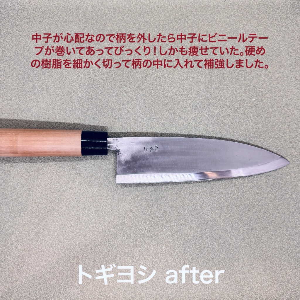 北王の出刃包丁は柄にビニールテープが巻いてあり満身創痍な状態。最初に柄を動かしてみたら、グラつかないのでそのままで研ぎますと伝えてましたが、気になって柄を外したらびっくり!中子が痩せていてそこにビニールテープを巻いて差し込んでありました。柄を外してよかった。このまま渡したら柄スッポリ抜ける所でした。刃先の方は何ヶ所か欠けていたので刃線を整えながら落とし、切刃は18度くらいで研ぎ直しました。