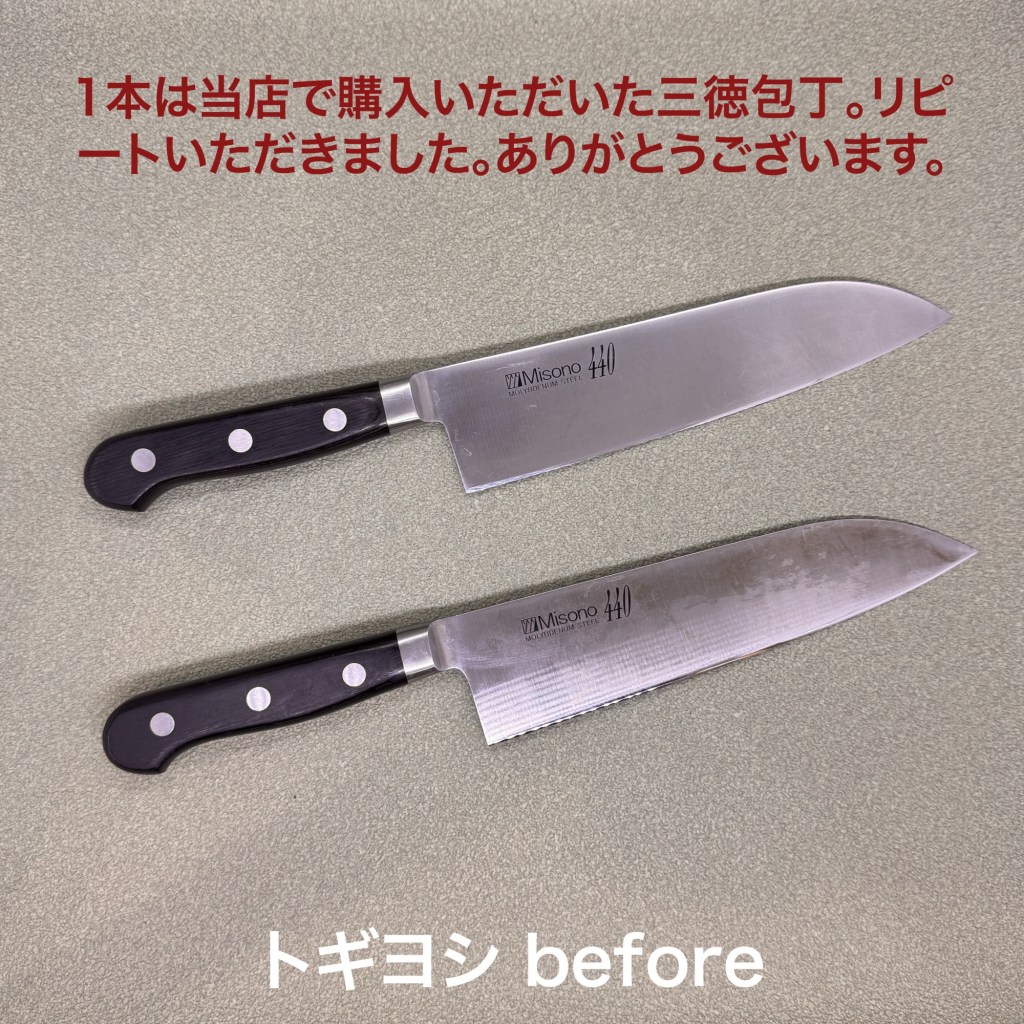 ミソノ440の三徳包丁の研ぎをご依頼いただきました。一本は当店ご購入いただいたモノ。少し油汚れが残っていたのでアルス刃物クリーナーで落としています。刃先の方は細かい傷みが有りますが問題ありません。荒砥から順に仕上げて良い刃になりました。