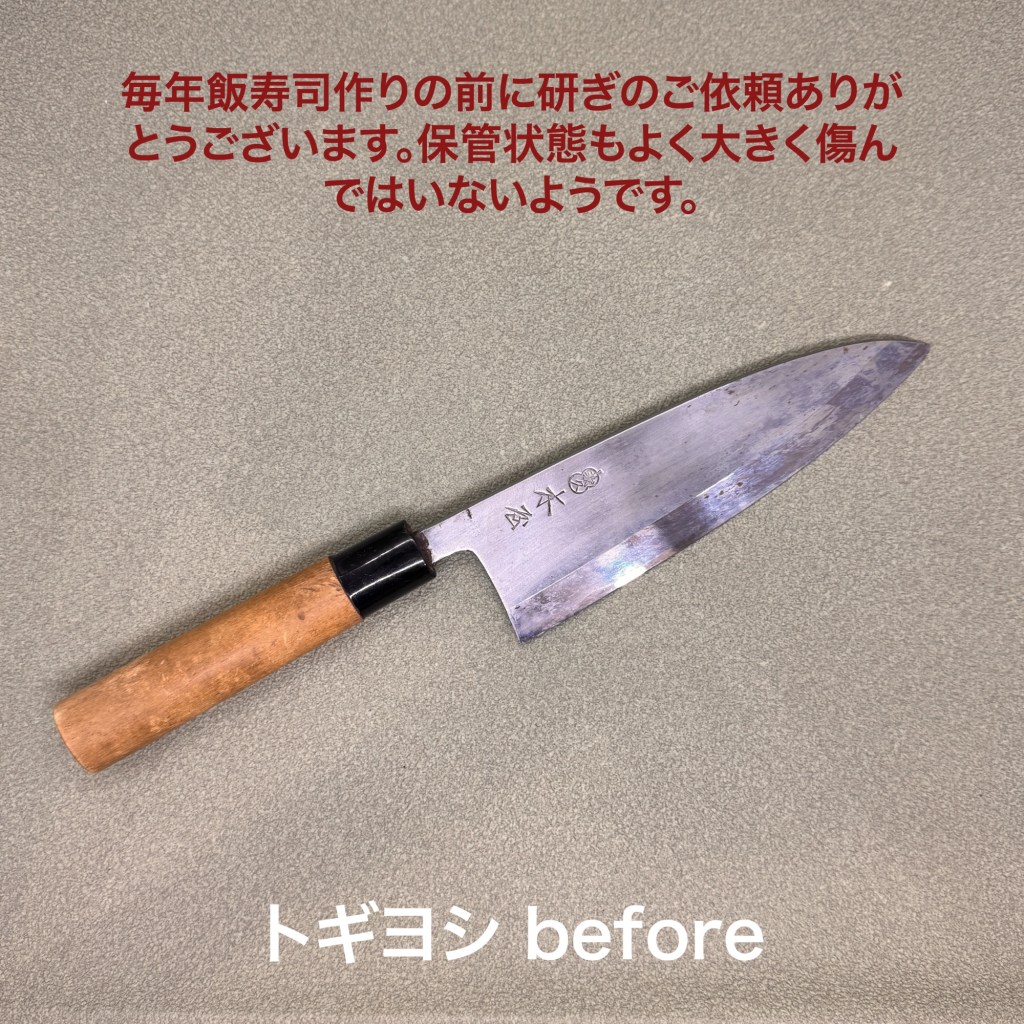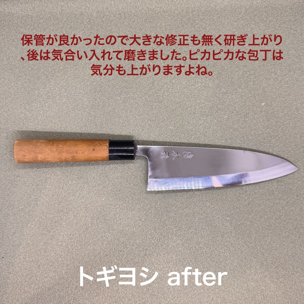木屋の出刃包丁。毎年飯寿司作りの前に研ぎに出してくださるお得意様。ありがとうございます。保管状態も良く錆びも浮いていませんし、刃先の傷みも少ないようで、スムーズに研ぎ上がりました。今回は骨にも負けないように研いでいます。また気合い入れて磨き込みました。やっぱり包丁はピカピカの方が気分も上がりますよね。