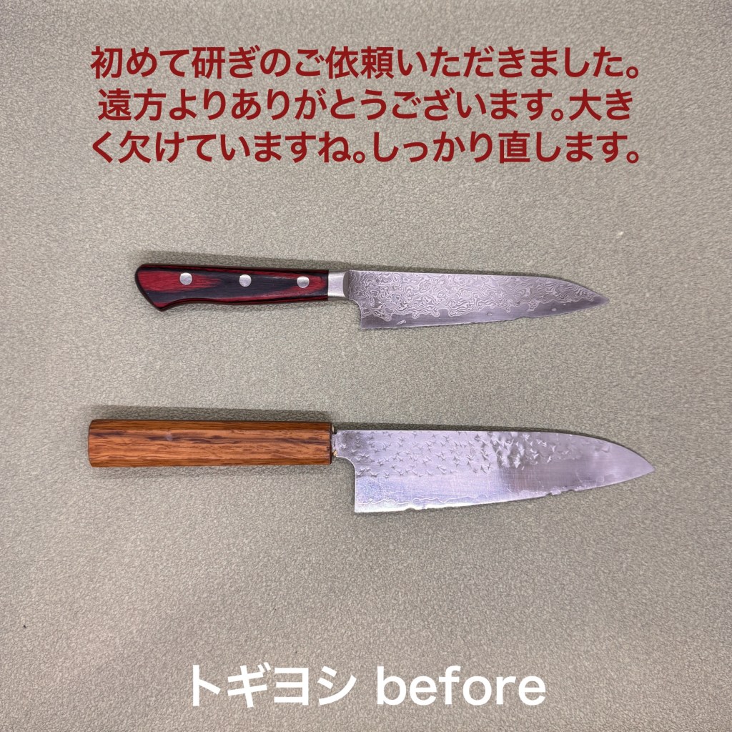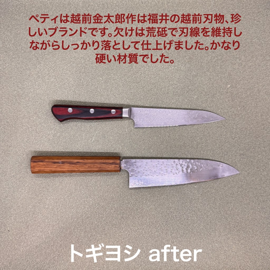 遠方のお客様よりご依頼いただきましてありがとうございます。ペティは越前金太郎というブランド。越前🟰福井県も刃物産地なんですよ。どちらも欠けており、大幅に削ることに。刃線を崩さないように全体を落とした後から刃の黒幕で研いでいます。どちらもとても硬い材質で、これなら割れるよねと思えるほどでした。ペティは少し黒ずんでいたようで、ゴム砥石で磨いています。