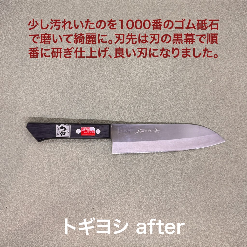 吉乃作三徳包丁。遠方から郵送にて研ぎのご依頼をいただきました。ありがとうございます。研ぐ前の状態を確認すると刃先の摩耗が進んでいて刃先に光を当てた時に見える白い線がだいぶ幅がありました。研がれた包丁は白い線が見えません。欠けなどの傷みは皆無。無理な使い方はされていないことが判ります。少しあった汚れは傷が付かないように1000番のゴム砥石で磨いて綺麗に!刃先の方は刃の黒幕で荒砥から順に研いで良い刃に仕上がりました。今回のように遠方から研ぎを依頼したいときは、丸甲金物に元払いで送ってください。出来上がり次第代引き便で返送いたします。