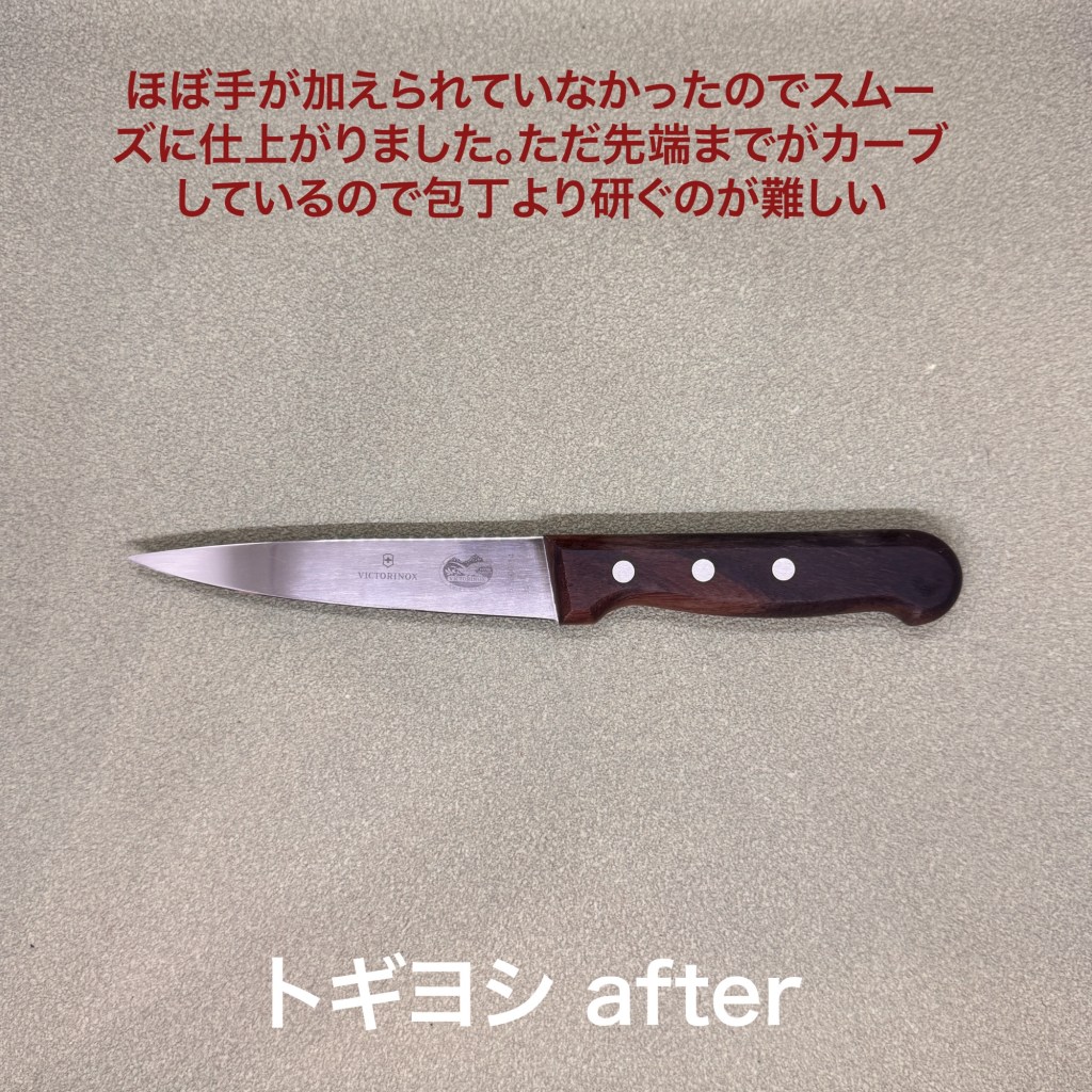 ビクトリノックスのナイフは鹿を解体する時に使うナイフ。鹿用は包丁のように研ぐとすぐ切れなくなるそうで、前に一度失敗しています。今回も角度に気をつけて鹿肉に対応する角度で仕上げました。