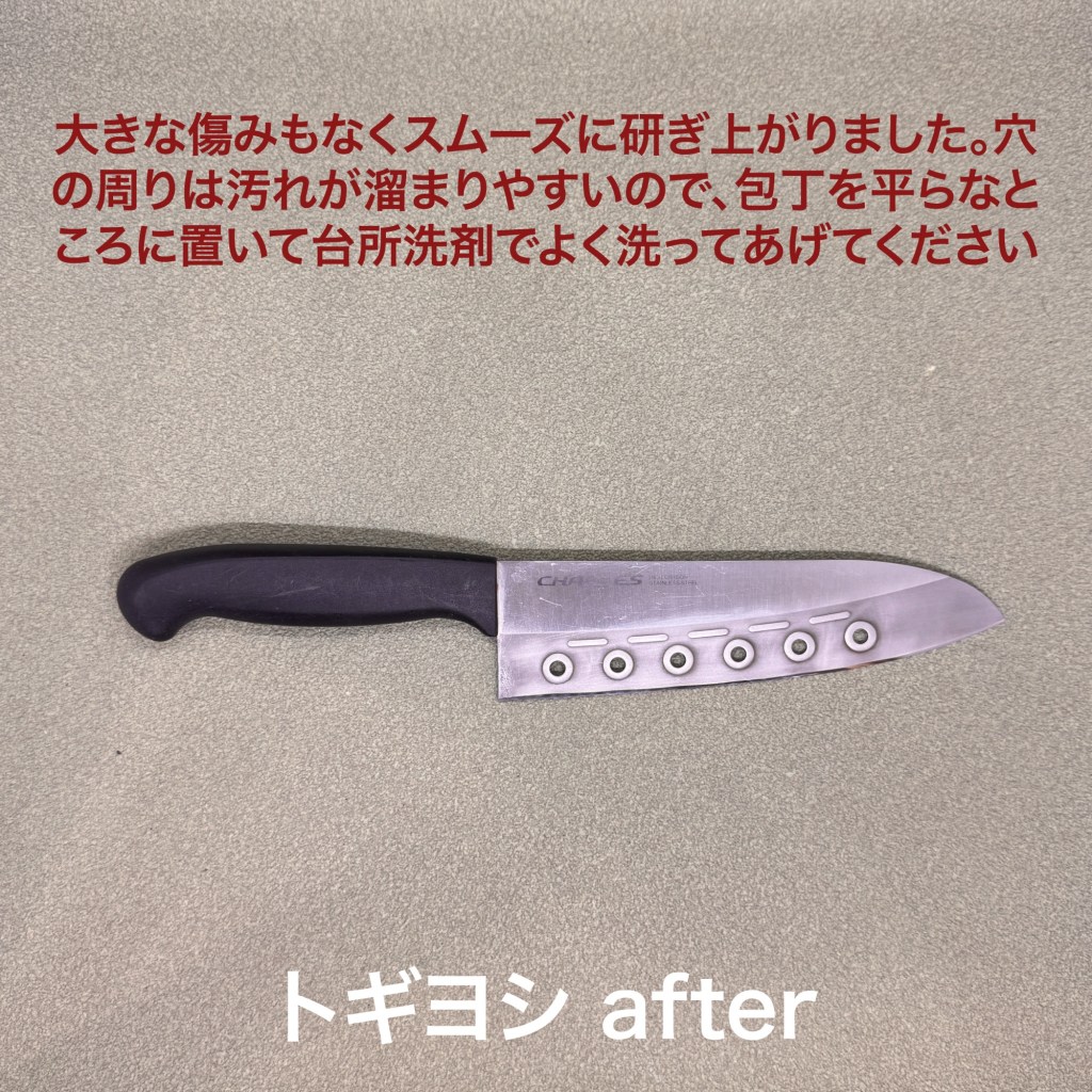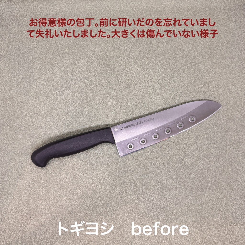 CHARLESの三徳包丁。以前に研いでいるのに、新規のお客様と勘違いしてし失礼しました。穴が空いているのが特徴の包丁。傷みは少なかったのでスムーズに仕上がりました。
