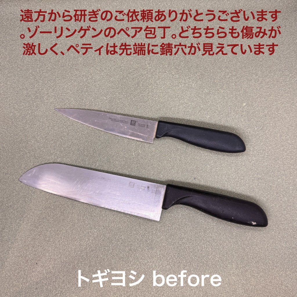 ゾーリンゲンのペア包丁は遠方から研ぎのご依頼いただきましてありがとうございます。刃先の傷みが激しく、ペティは先端に錆穴が見えています。また汚れも残っていて刃物クリーナーでクリーニング。三徳包丁は傷が多いのでCNSベベルで磨いてから仕上げました。
