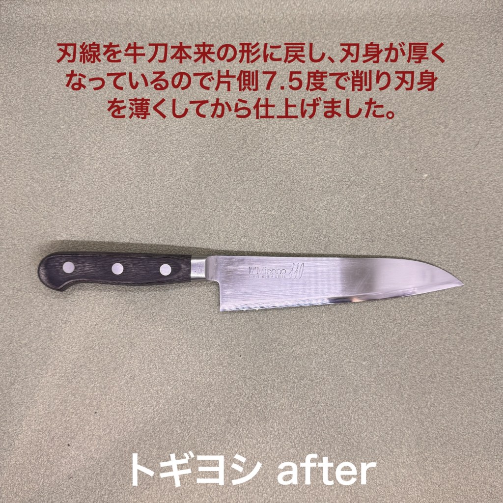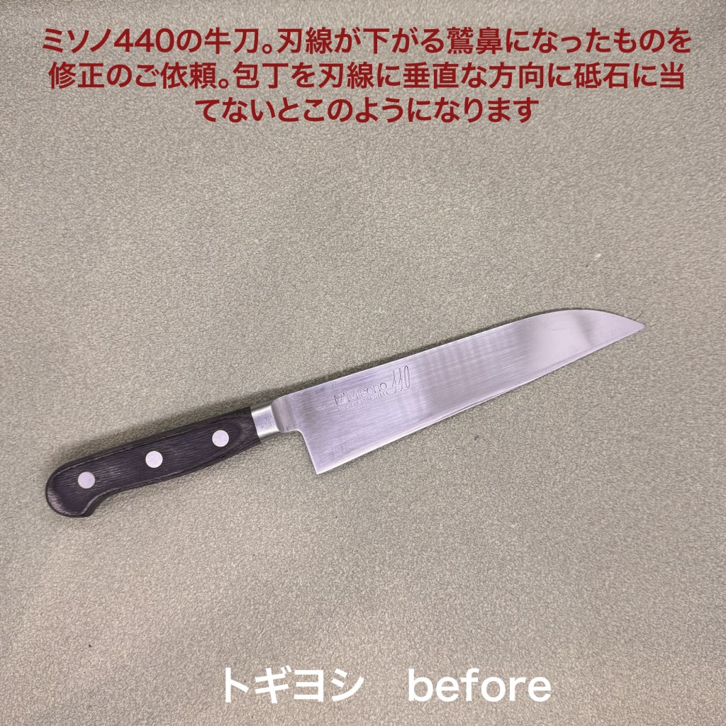 ミソノ440牛刀は、刃線が下がってしまう鷲鼻に研がれてしまっているのを修正でお預かりしました。刃線は緩くカーブしています、カーブしているところを手元の直線部分と同じ向きで研ぐとこのようになってしまいます。数学的にいうとカーブの接線に垂直な方向に砥石を当てることで均一に研ぐことができます。