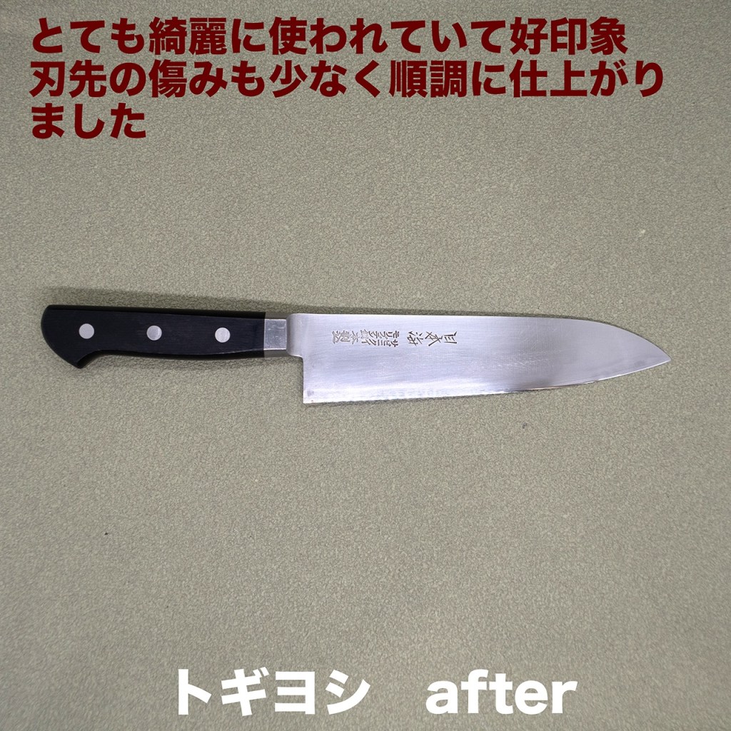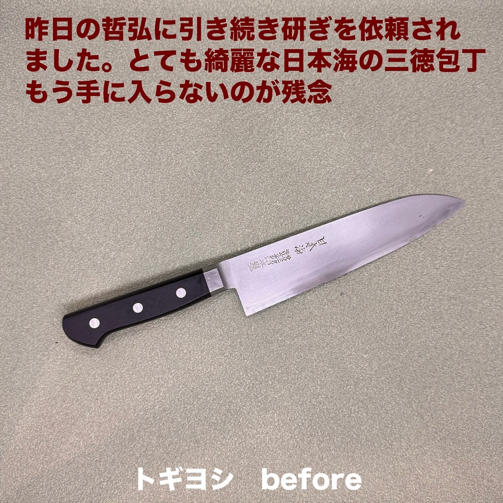 日本海のステンレスの割り込み包丁。昨日の哲弘に引き続き研ぎに出してくださいました。芯金も錆びていないのでステンレスモリブデン鋼のようです。研いだ感じは硬過ぎず柔らか過ぎずちょうど良い感じでした。