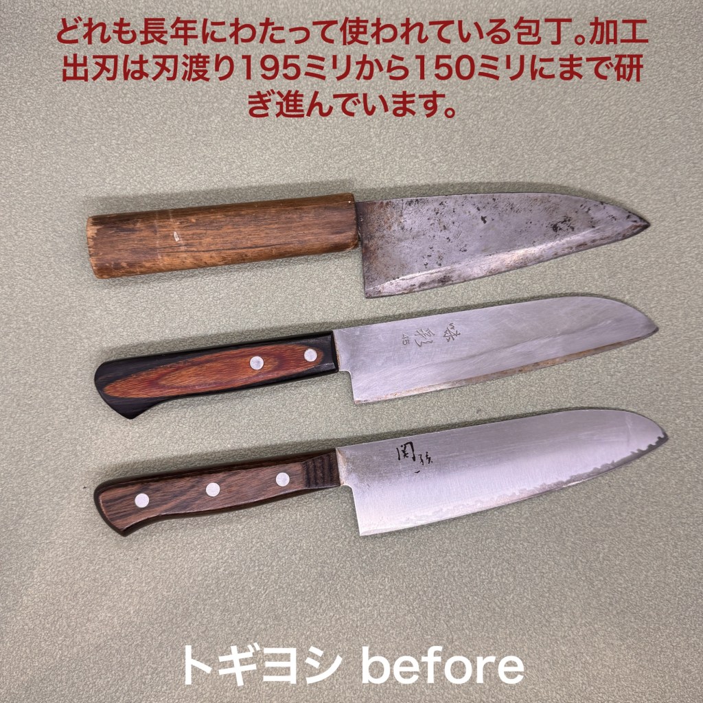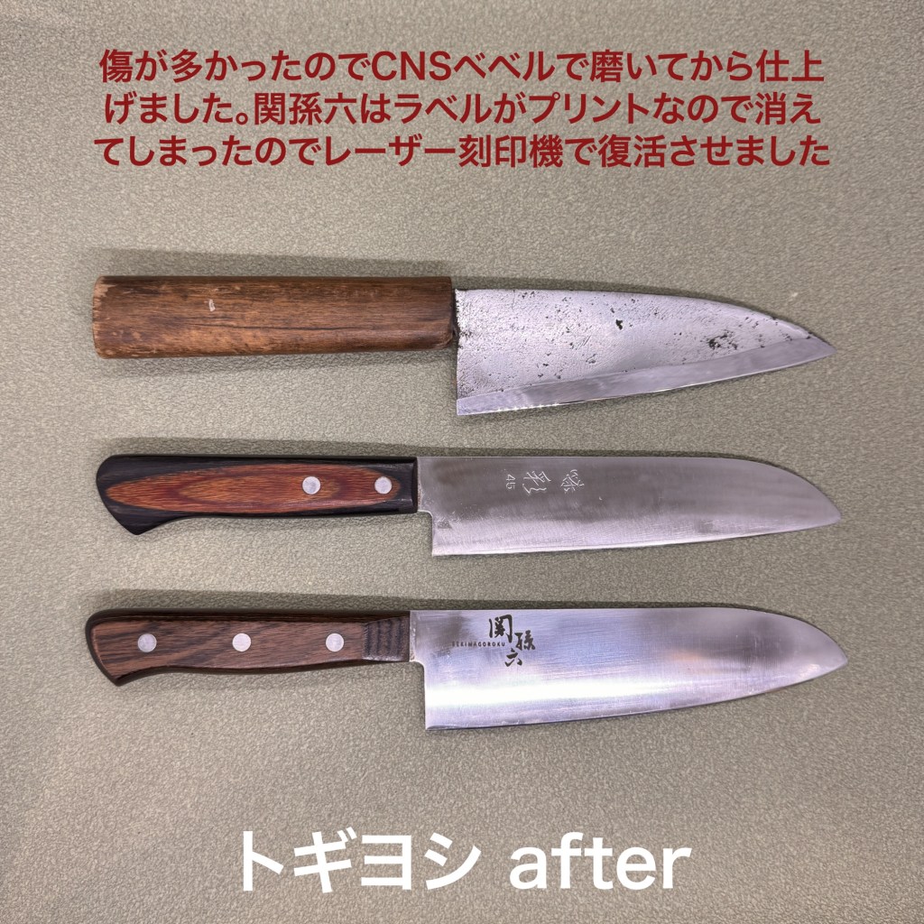 関孫六の三徳包丁、味彩の三徳包丁、堺(信)の加工出刃はとても長く使われていて50年以上とのこと。加工出刃は元は195ミリあったものが150ミリになるほど使われています。ただ錆が深いので刃先に錆穴が2、3箇所残ってしまいました。三徳包丁はどちらも裏が全く研がれておらず片刃のような状態。芯の鋼ではなく鋼を支える柔らかい金属が刃先にかかっていて切れ味が良くなかったと思います。裏を5度で削り直して、芯金をしっかり出して、本来の形に戻して仕上げました。関孫六の刻印が消えたので、レーザー刻印で復活しています。