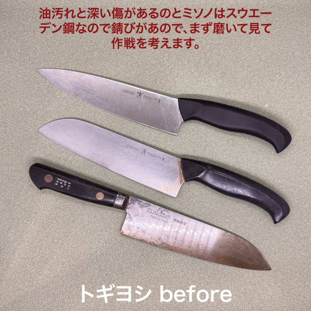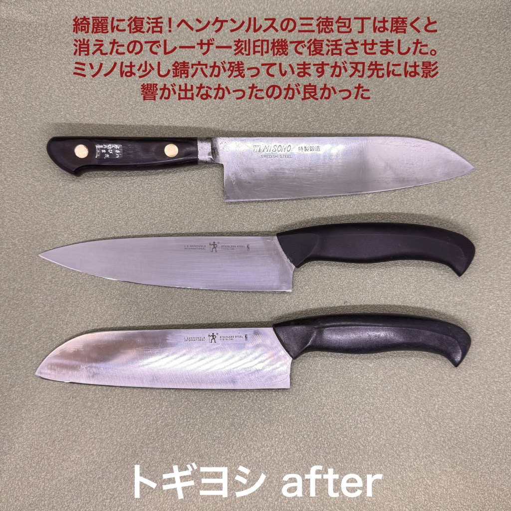 ヘンケルスの牛刀と三徳包丁とミソノのスウエーデン鋼三徳包丁は長く使われていて、満身創痍ですが、ほぼ手付かずですので研ぎやすいと思います。三徳包丁はcnsベベルで磨いています。ヘンケルスはラベルが消えたのでレーザー刻印で復活させました。研ぎの方はどれも順調に仕上がり、特にミソノのスウエーデン鋼は一段と良い仕上がりになりました。