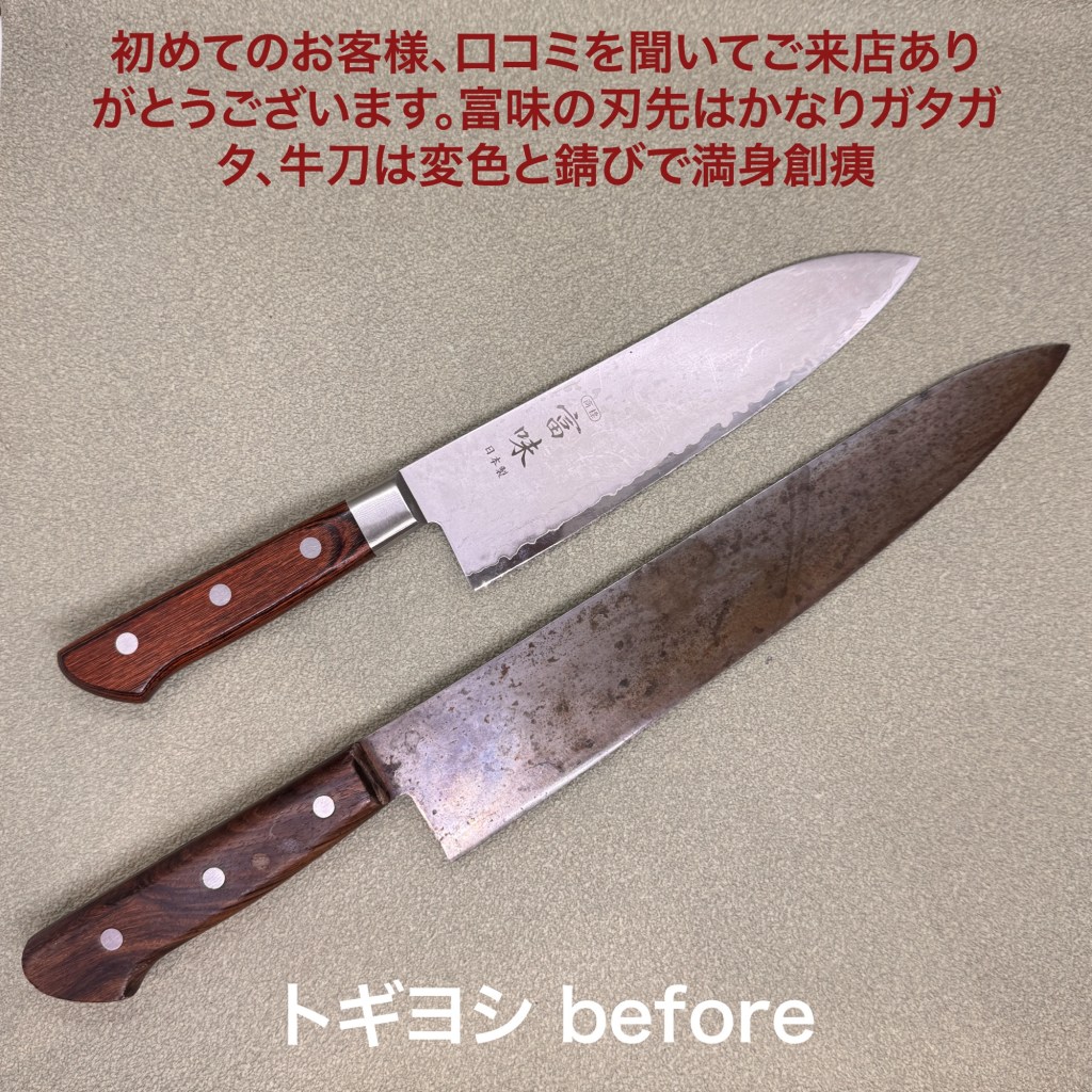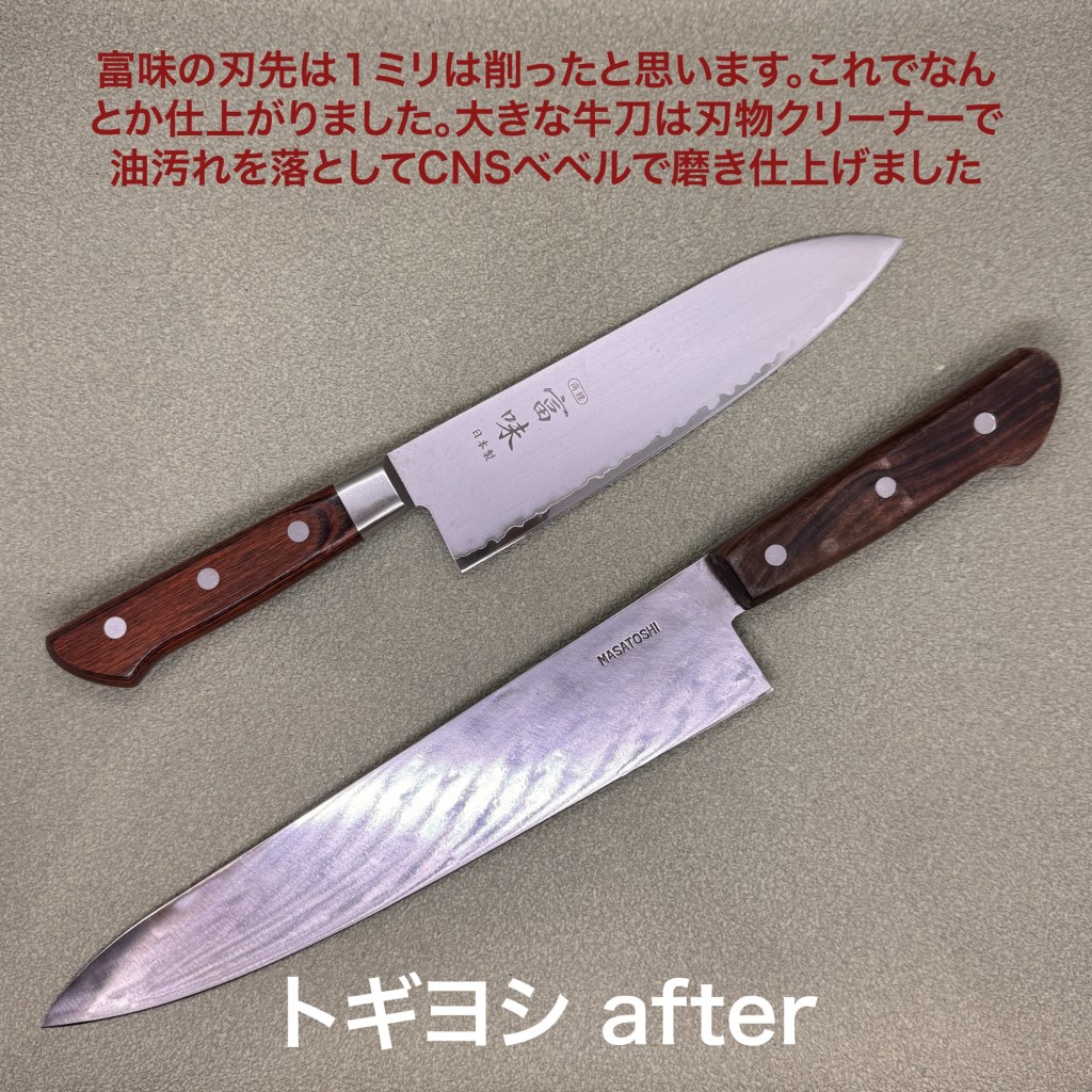 富味の三徳包丁とMASATOSHIの牛刀は口コミを聞いてご来店頂きました。ありがとうございます。三徳包丁は刃先に強い当たり傷というか凹みが複数あり1ミリは落としています。傷が無くなったのを確認して研ぎ上げました。牛刀は全鋼なので錆びと油汚れで茶色になっていましたが刃物クリーナーで落とした後、表面は傷が深かったのでCNSベベルで磨き綺麗に復活させ、そこから研ぎ上げました。刃が長いので角度を維持するのが大変でした。