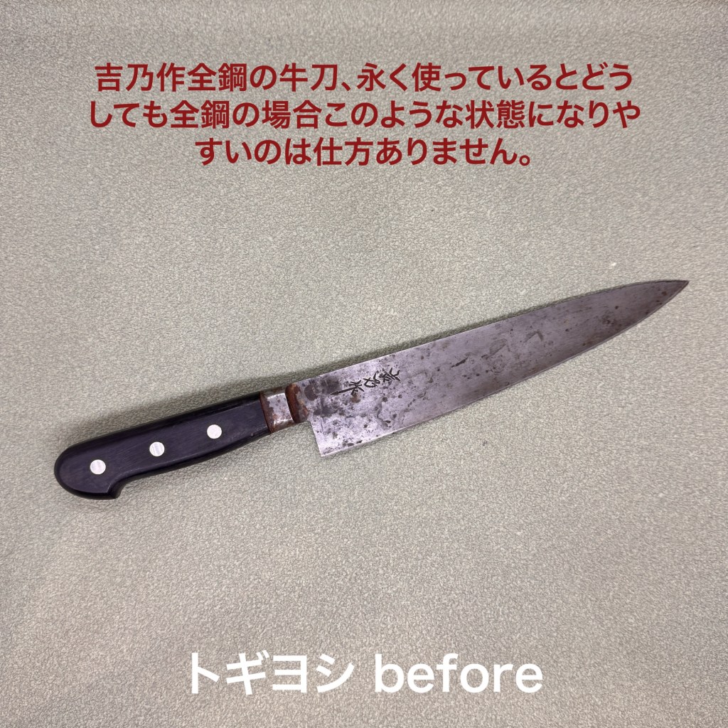 吉乃作牛刀は全鋼。したがってどうしても錆びが発生します。刃の方はそれほどでもありませんが柄は錆びで膨らんでしまい隙間ができています。トギヨシでは柄の修理は受け付けておらず、セメダイン ハイスーパータフで埋めて対処しています。刃先の方はこれまでの研ぎで全体がカーブしていて、真っ直ぐ降ろして食材を綺麗に切れる状態ではなかったので刃線を整えて牛刀本来の形に近づけてから仕上げました。