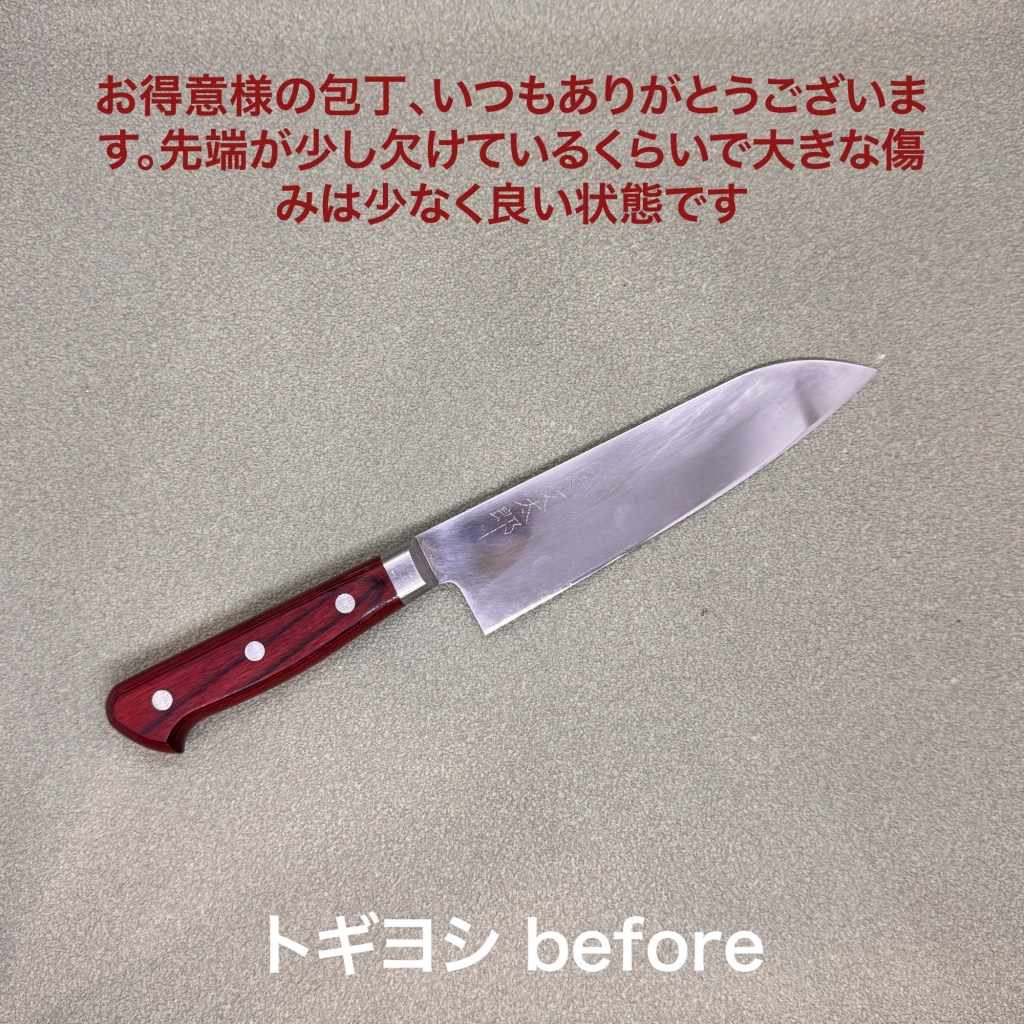 宮文 文太郎の三徳包丁はお得意様の包丁。いつもありがとうございます。刃先の傷みも少なくとても綺麗に使われています。先端がちょっとだけ欠けていましたが荒砥500番で簡単に落とせました。結構硬い芯金なので研ぎ上がりも最高です。