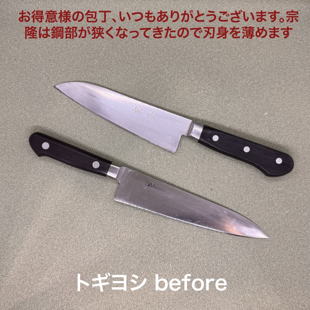 お得意様の包丁。いつもありがとうございます。宗隆は修学旅行土産の定番。芯金が見える部分がほぼ無くなって刃身も厚くなったので刃身を落として仕上げました。