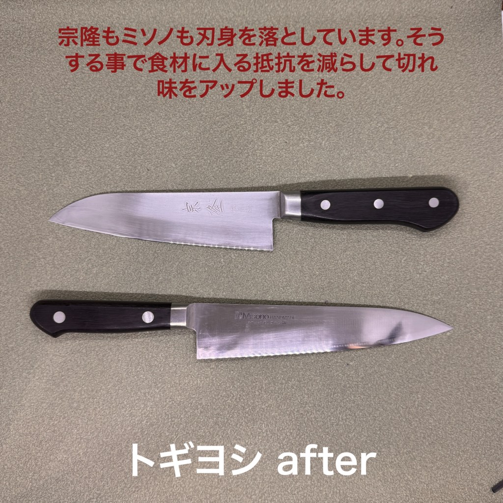 ミソノの牛刀も新品と比べると刃身が厚くなっているのが判ります、厚くなると食材に入る時の抵抗が増えて切れ味が悪く感じるので片側5度で刃先1ミリほど残して削ってから仕上げました。全部5度で削ってしまうと薄くなりすぎて割れます。