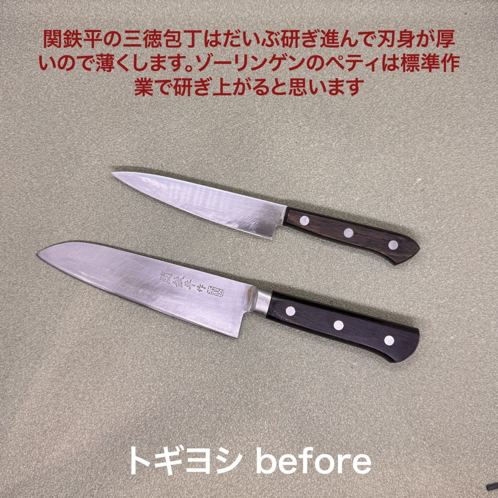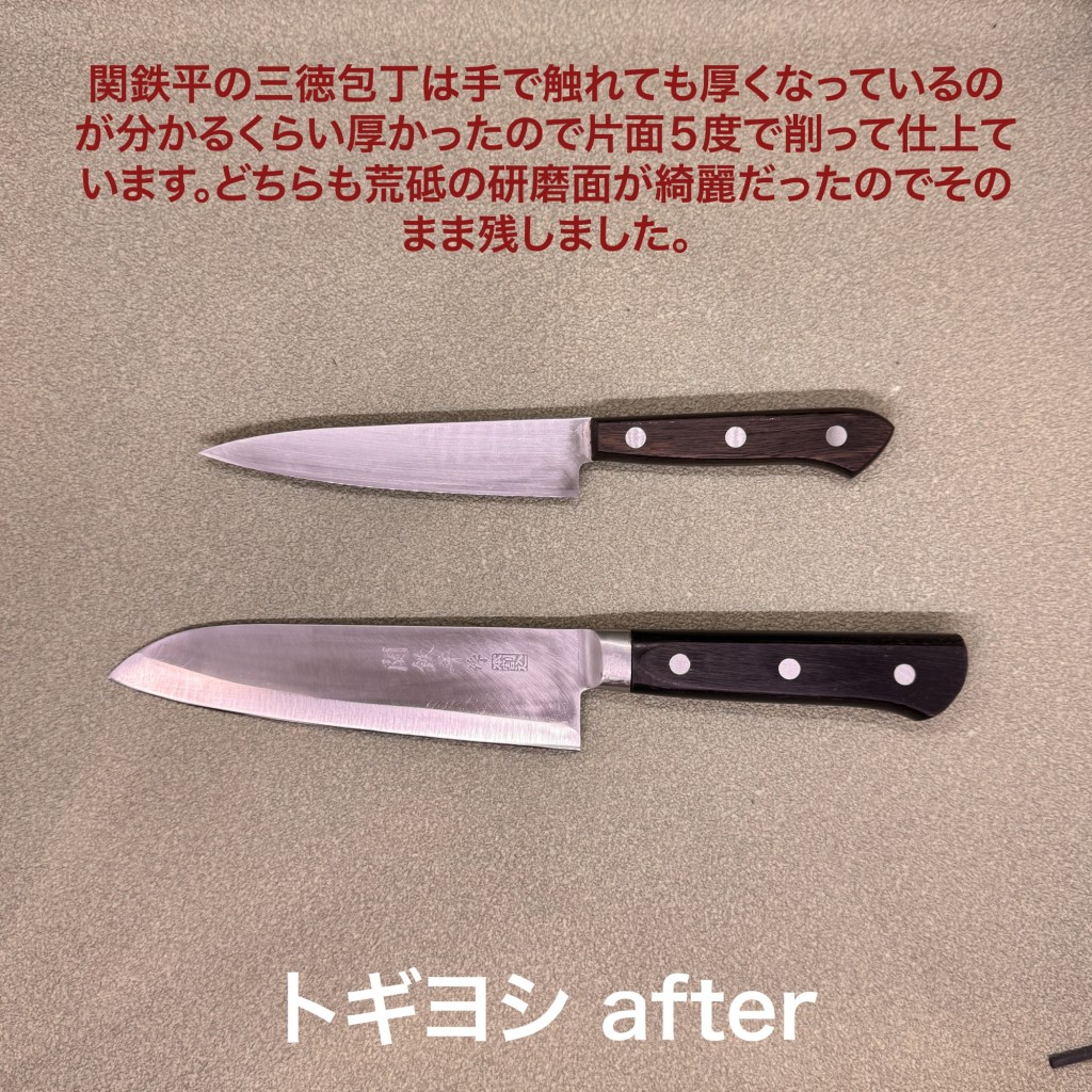 関鉄平の三徳包丁とヘンケルスのペティナイフ、三徳包丁は研ぎ進んでかなり厚くなっていましたので、片面5度で薄くして芯金がちゃんと働くようにしています。ペティも若干厚くなっていましたので片面10度で検索してから仕上げました。どちらも荒砥の研ぎ目が綺麗だったのでそのまま残して仕上げました。