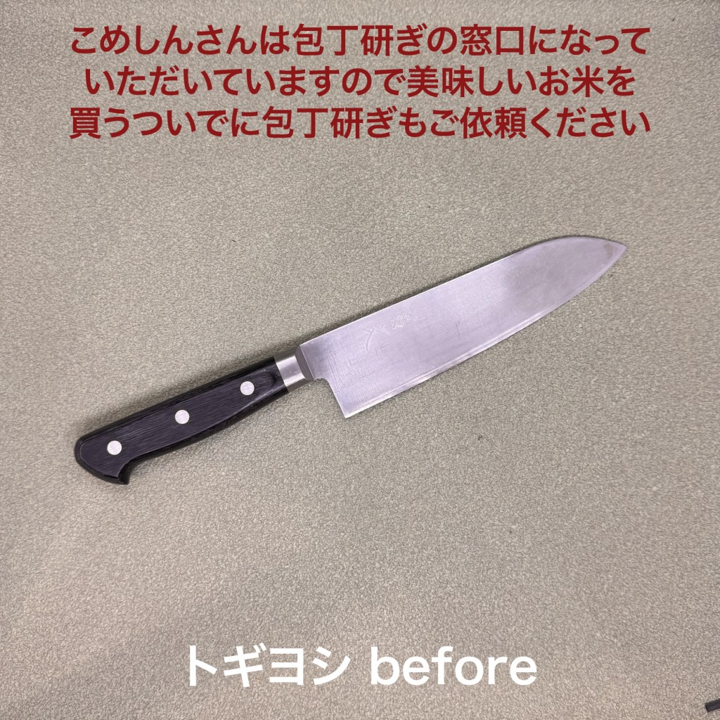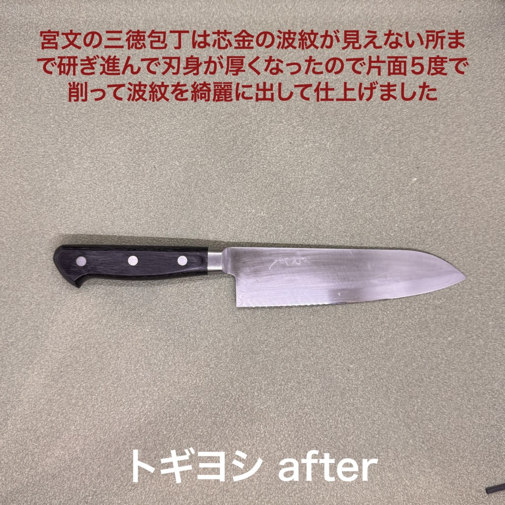 こめしんさんからお預かりした宮文の三徳包丁。こめしんさんは包丁研ぎの取次をしてくださっています。美味しいお米を買うついでに包丁研ぎのご依頼されてはいかがでしょうか?包丁の方は芯金の波紋が見えないほど研ぎ進んでいて刃身も熱くなっていたので薄くしてから仕上げました。製造時の研磨痕が荒いのでcnsベベルで磨きました。