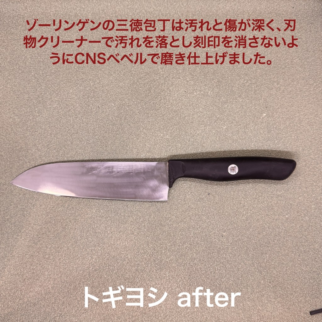 ゾーリンゲンの三徳包丁はご近所からのご依頼。道が滑るので怖くて持って行けないとの事で、引き取りしてきました。汚れと傷があり、刃物クリーナーで汚れを落とし、cnsベベルで傷を消してから仕上げました。刻印は簡単に消えてしまうので、できるだけ残しました。