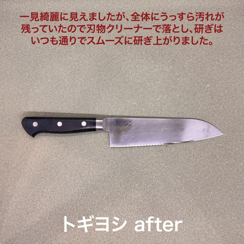 宮文の三徳包丁はお得意様の包丁。いつもありがとうございます。見た目は綺麗ですがうっすら汚れが残っていたのでアルスの刃物クリーナーで拭いて綺麗にしてから研ぎ始め、自分の形になっているのでスムーズに仕上がりました。