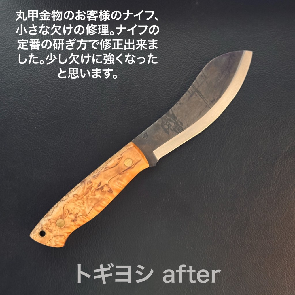 丸甲金物のお客様からお預かりしたナイフ。主にキャンプで使用しているとの事。ナイフの定番の研ぎ方は角度30度で小刃を付けるのですが、このナイフはそうなってはおらず、包丁のように刃先が鋭利で薄いので欠けやすかったと思います。荒砥で片側30度で研ぐ事で欠けに強い刃にしました。