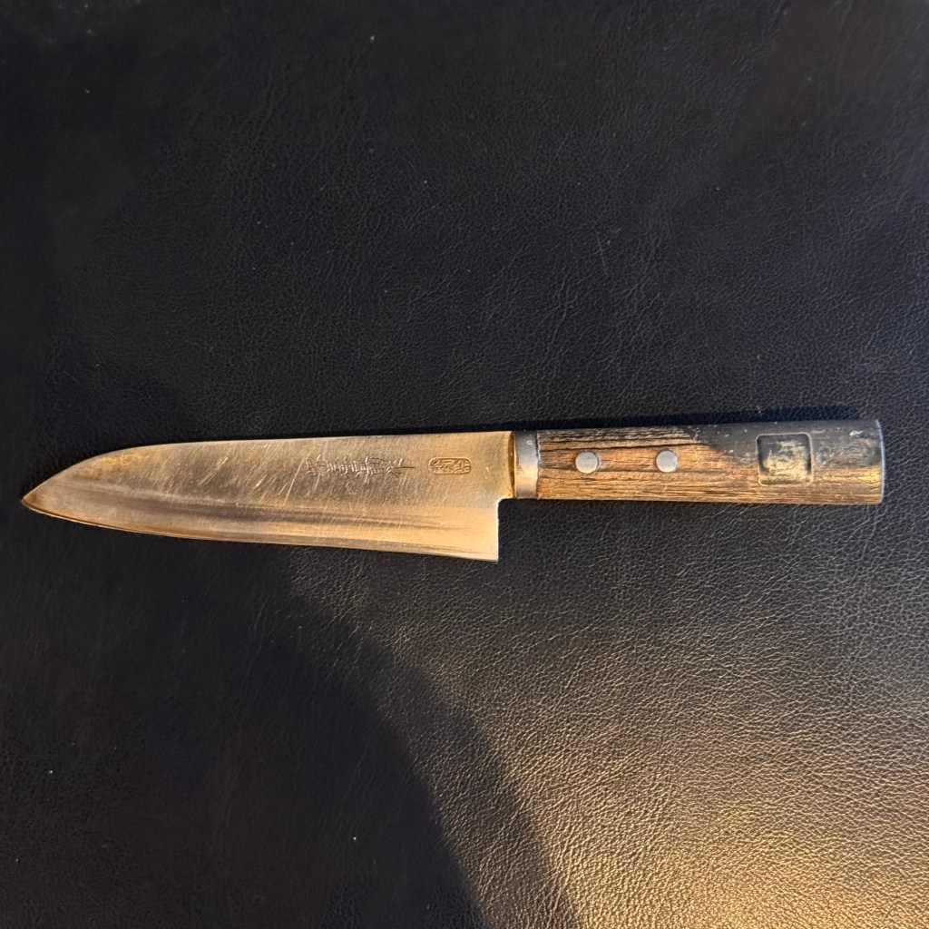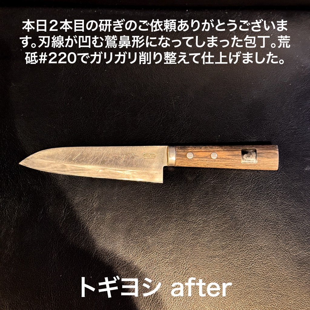 堺屋直助の牛刀。刃線が凹む鷲鼻になっていました。荒砥の出番!#220でガリガリ削って刃線を整えてから研ぎに入ったのですが、刃先をだいぶ落としたので芯金を出すのにひと苦労。そこから定型の研ぎに入り仕上げました。あと柄に油が蓄積していたのでアルスの刃物クリーナーでとインパクトクリーナーで除去して完成!ご本人も大満足でした。