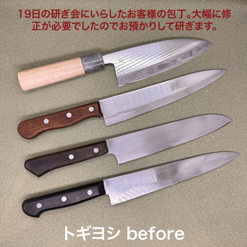 出刃一本と牛刀3本は1/19のイベントでお預かりしたモノ。その場で見てこれは修正するのに時間がかかると予想されました。牛刀2本は研ぎ進んでしまい、刃身の厚いところに鈍角の刃を無理矢理つけた状態。刃の角度は60度くらいあったのでは?それでは切れません。まず水研機で片側5度で切刃を作りますが、元の研ぎがアンバランスで、全長の半分はいつまで削っても刃先まで砥石が当たらず少し残して荒削りをやめました。後は手研ぎに移り休憩しながら仕上げ切ました。いやーかなりの作業量。1番楽だったのは出刃包丁というオチ。