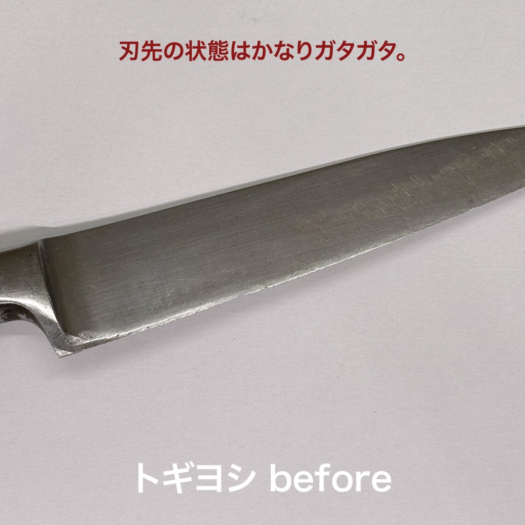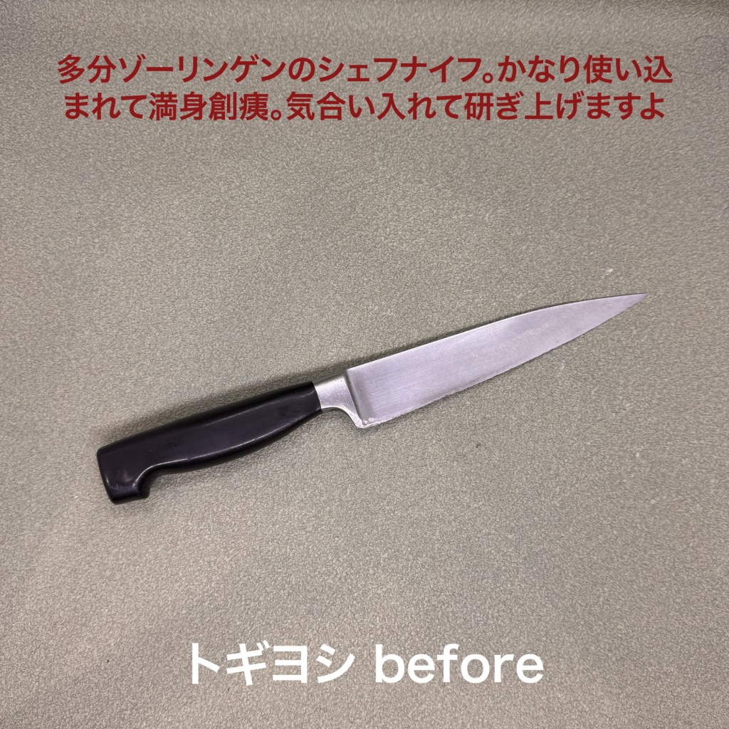 ゾーリンゲンのシェフナイフと思われる包丁。だいぶ使い込まれて満身創痍。刃先はかなりガタガタ。荒砥で落とすのですが手元近くの出っ張りの影響で端まで砥石が当たらず苦労しました。刃の腹も傷だらけだったの荒砥から砥石で磨いて綺麗になりました。