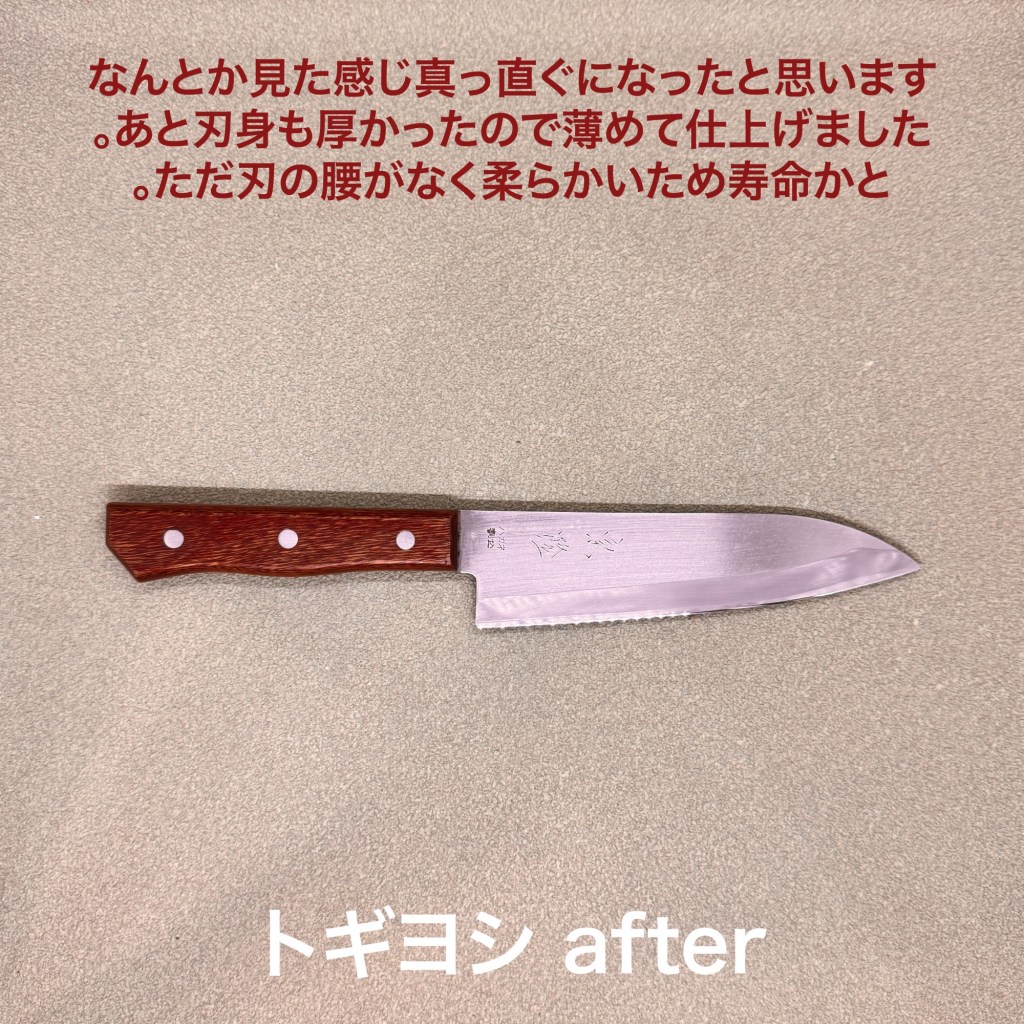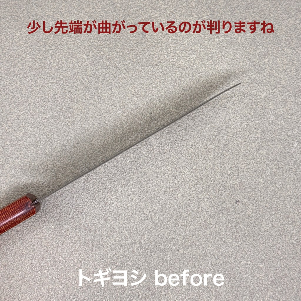 宗隆の牛刀はお得意様の包丁、いつもありがとうございます。今回はかぼちゃを切った時に曲がってしまったとの事で曲がりの修正と研ぎのご依頼。曲がりは指ですぐ戻せるほど刃の腰が無くなっています。これは危ないですよね。かぼちゃを切るには危険ですが野菜や肉ならまだ使えますがそろそろ寿命と思った方が良いと思います。