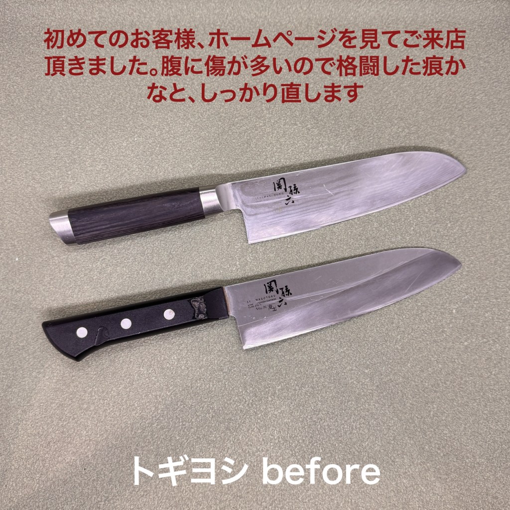関孫六の三徳包丁2本は初めてのお客様。ホームページを見てご依頼頂きました。全体の傷を見ると研ごうとして格闘したと思われますが、刃先には届いていなかったようです。刃先は新品の時とあまり変わっていないようでスムーズに研ぎ上がりました。