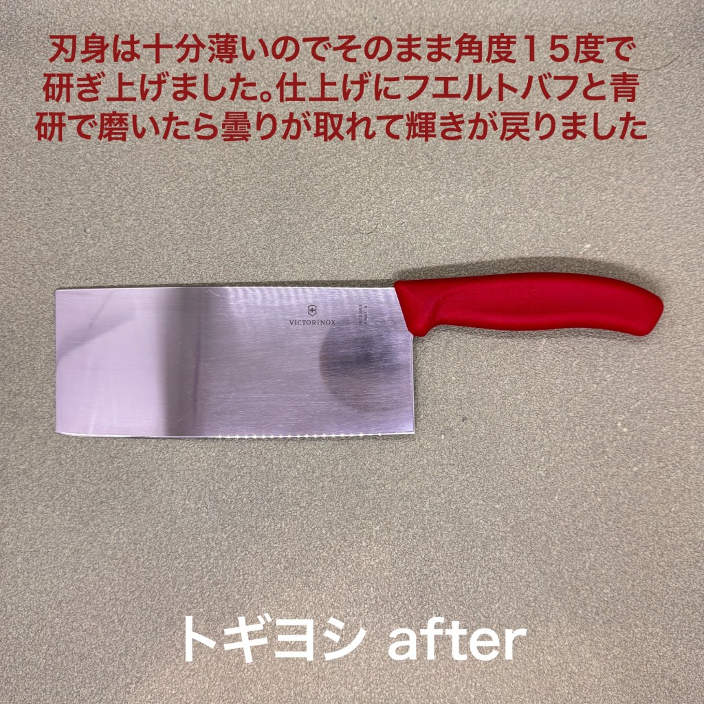 以前研いだ中華包丁、半年ぶりにリピートしていただきました。ありがとうございます。刃先はまるまる状態。切れなくて我慢されていたと思います。とても綺麗に使われていて、刃身も十分薄いのでそのまま15度で研ぎ上げました。