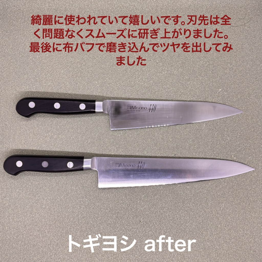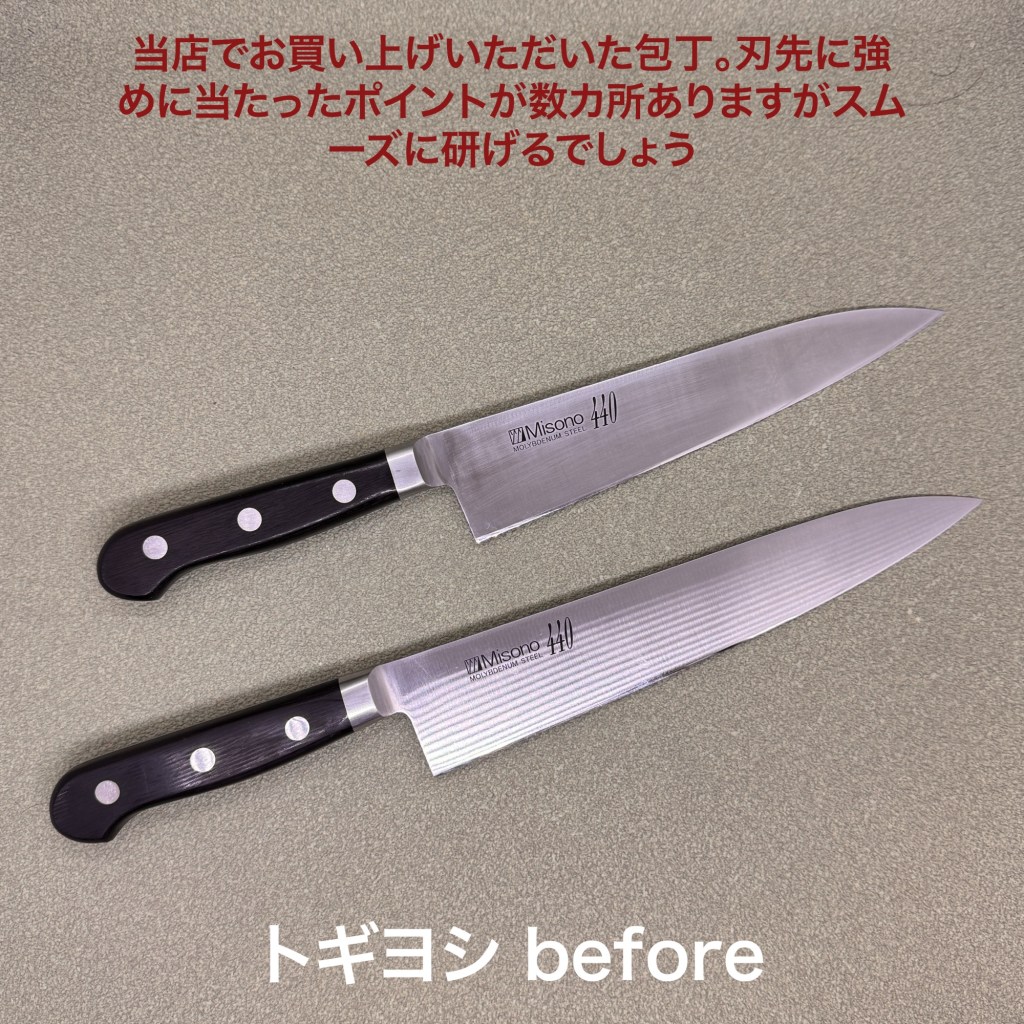 ミソノ440牛刀2本は当店から購入していただいたお客様ありがとうございます。刃先を見ると強めに当たったポイントが何箇所かあるくらい。全体的にとても綺麗に使われていて嬉しい限り。研ぎの方はそれほど傷んでいないので500番から始めて問題なく仕上がりました
