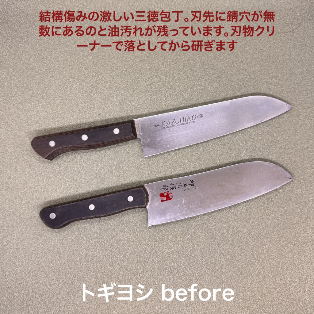 2本の三徳包丁は初めてのお客様ありがとうございます。刃先は結構傷んでいて錆穴が無数にある状態。加えて油汚れが残っていて、その影響で錆穴が増えたと思われます。刃先は荒砥で落とし、油汚れは刃物クリーナーで落としています。研ぎの方は刃身も十分薄かったので順調に進み仕上がりました。