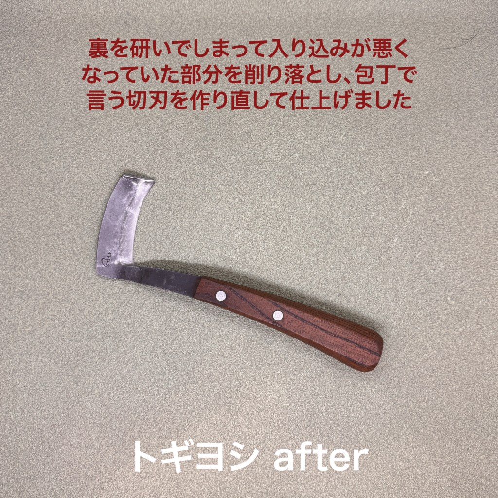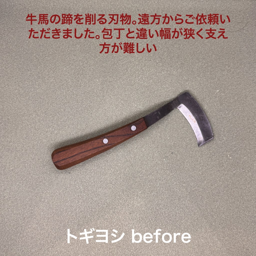 牛馬の蹄を削る刃物。遠方からご依頼いただきありがとうございます。釧路の獣医さんの同じ刃物を研いでいるのを見つけてくださいました。独特の形をしていて保持が難しい刃物。包丁のようにスムーズにはいきません。スエヒロのR砥石でじっくり研ぎ上げました。