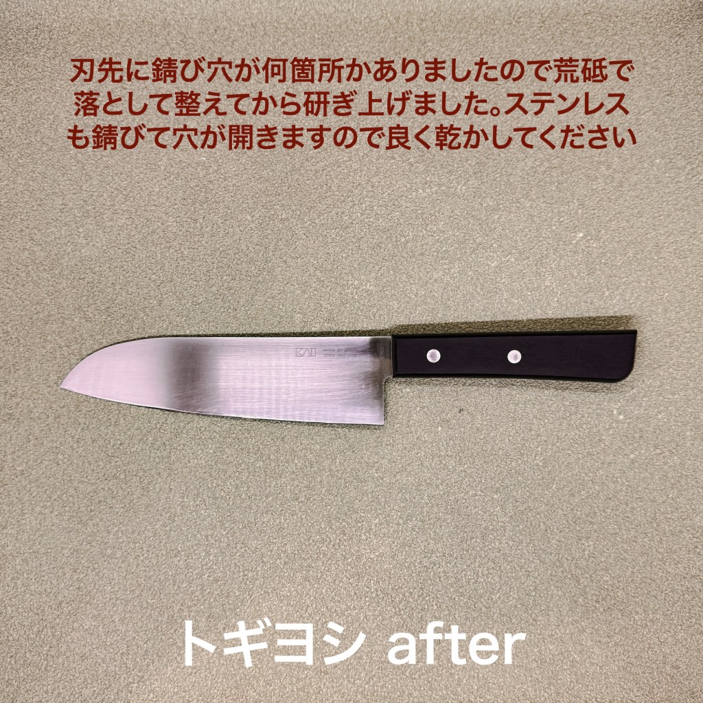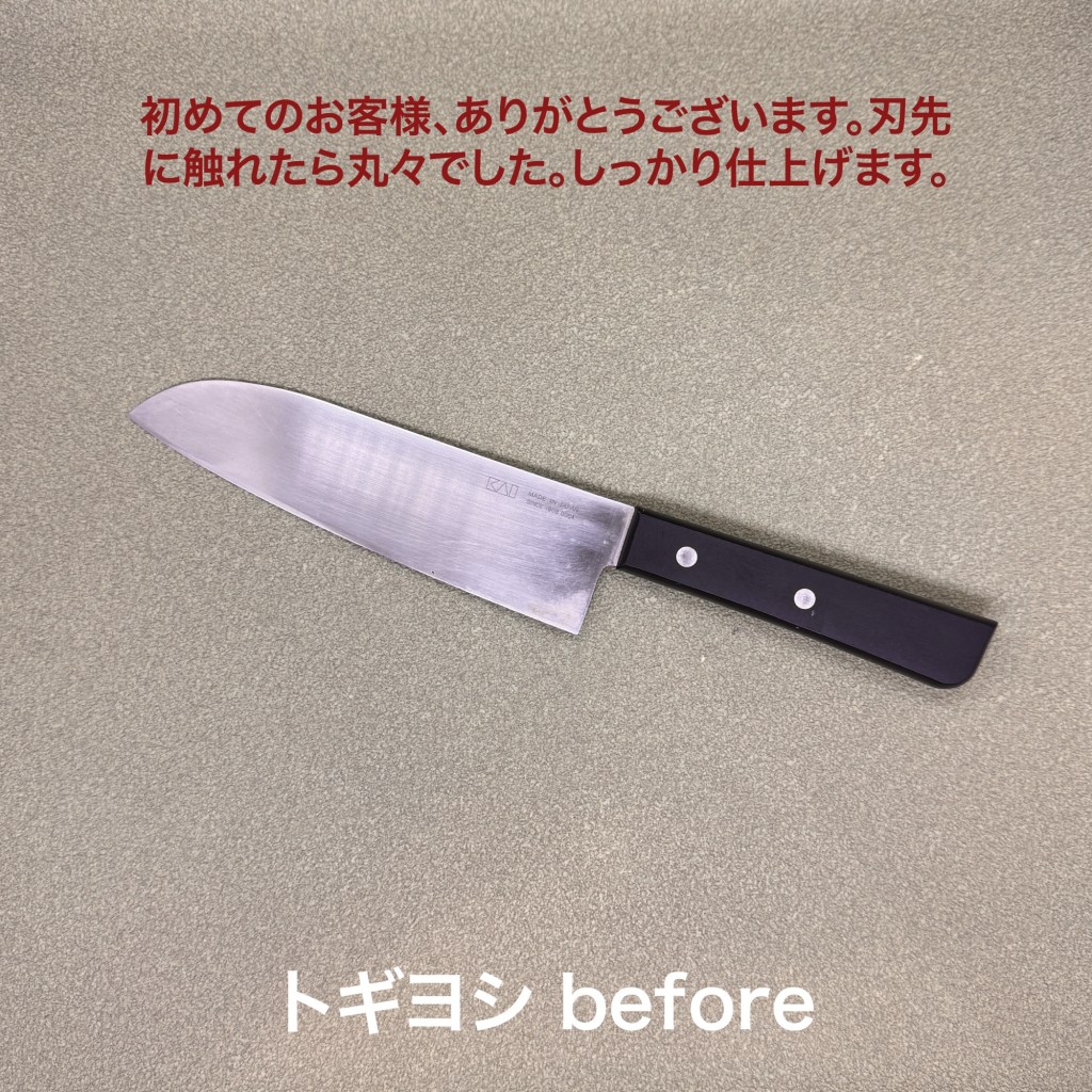 Kaiの三徳包丁は初めてのお客様。刃先を見ると錆穴が何箇所かありましたので、荒砥で削りながら刃線を整えて仕上げました。ステンレスも錆びますので、よく洗って乾かしてから締まってください。