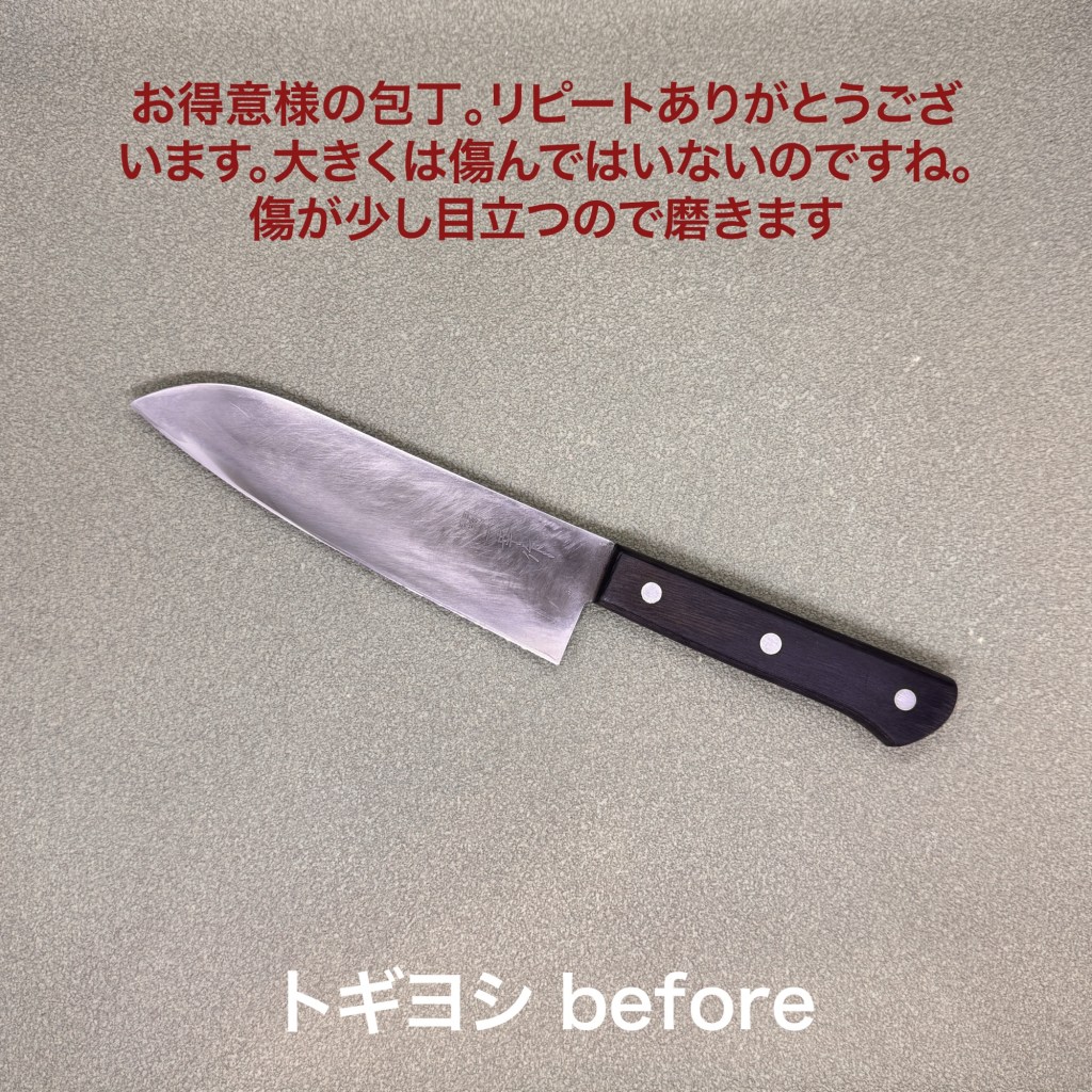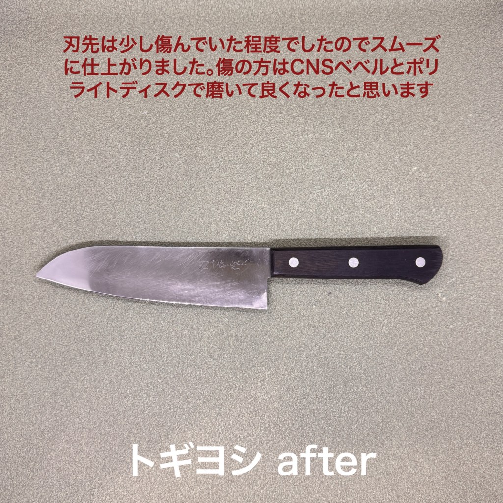 関一幸の三徳包丁はお得意様の包丁。いつもありがとうございます。刃先には大きな傷みは無くスムーズに仕上がりました。ただ傷が気になったので、cnsベベルとポリライトディスクで少し磨きました。