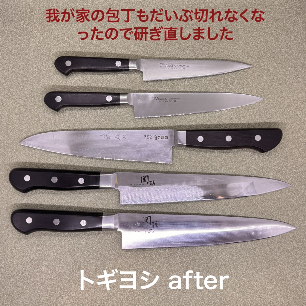 我が家の包丁達5本は妻から長ネギが切れないとのクレームが入り急遽確認したら、あらら刃先にキラキラがいっぱい(あたって刃先がつぶれると見えます)荒砥に当てるまでではないので中砥からで充分で仕上げもかけてバッチリ復活しました