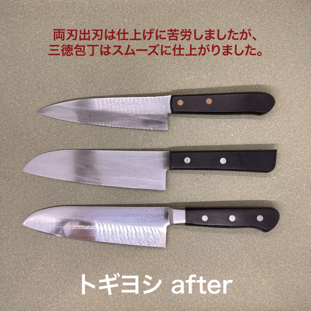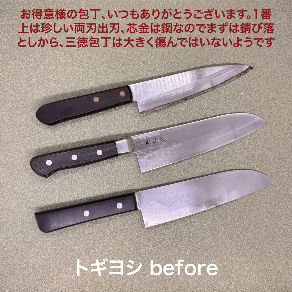 こちらもお得意様の包丁達。いつもありがとうございます。ノーブランドの三徳包丁は少し素材が柔らかめですね。仕上げが決まりにくかったのと、傷が多かったので一所懸命磨きました。関孫六の三徳包丁は素材が硬いので、良い感じで仕上がりました。富士印の両刃出刃包丁は刃先が錆びていたので砥石で錆びを落としながらの研いでいます。錆びた部分は結構しっかり硬さのある鋼でなかなか研ぎ上がらず苦労しました。