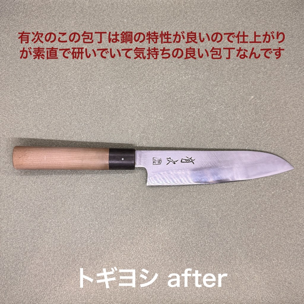 お得意様の有次の包丁、もう何回も研いでいます。いつもありがとうございます。この有次の包丁は鋼が良いのかとても仕上がりが素直で研いでいて気持ち良い包丁なんです。
