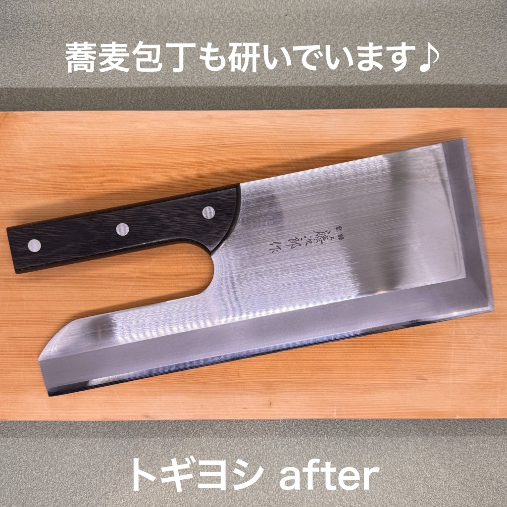 藤次郎の蕎麦切り包丁。蕎麦切りは重たいので角度を保つのにひと苦労。ですが、刃線も真っ直ぐで傷みも少な買ったのでスムーズに仕上がりました。美味しい蕎麦が出来上がるといいな。