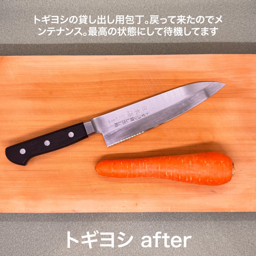 日本海の三徳包丁は、トギヨシの貸し出し用包丁。今日もお貸ししたお客様に感想を聞くと、目を大きくされて驚くほど切れましたと。嬉しい限り。
