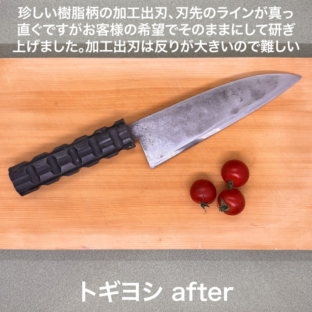 珍しい樹脂柄の加工出刃庖丁。刃先のラインが真っ直ぐになっています。お客様の希望でそのままで仕上げました。加工出刃は薄い作りなのでどうしても反りがあります。それを考慮して研ぐのが腕の見せ所