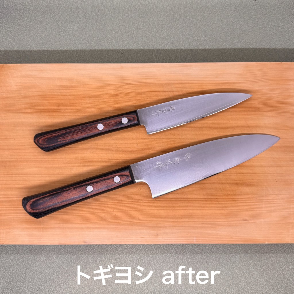 堺兼近のペア包丁(牛刀とペティ)刃先は結構傷んでいましたが、錆穴も無く綺麗な状態ですが、前に研いだ方の癖が強く、荒砥でガッチリ落としてから研ぎ始めました。材質はわかりませんが、ちょっと仕上げに手こずったので、粘りの強い材質かもしれません。